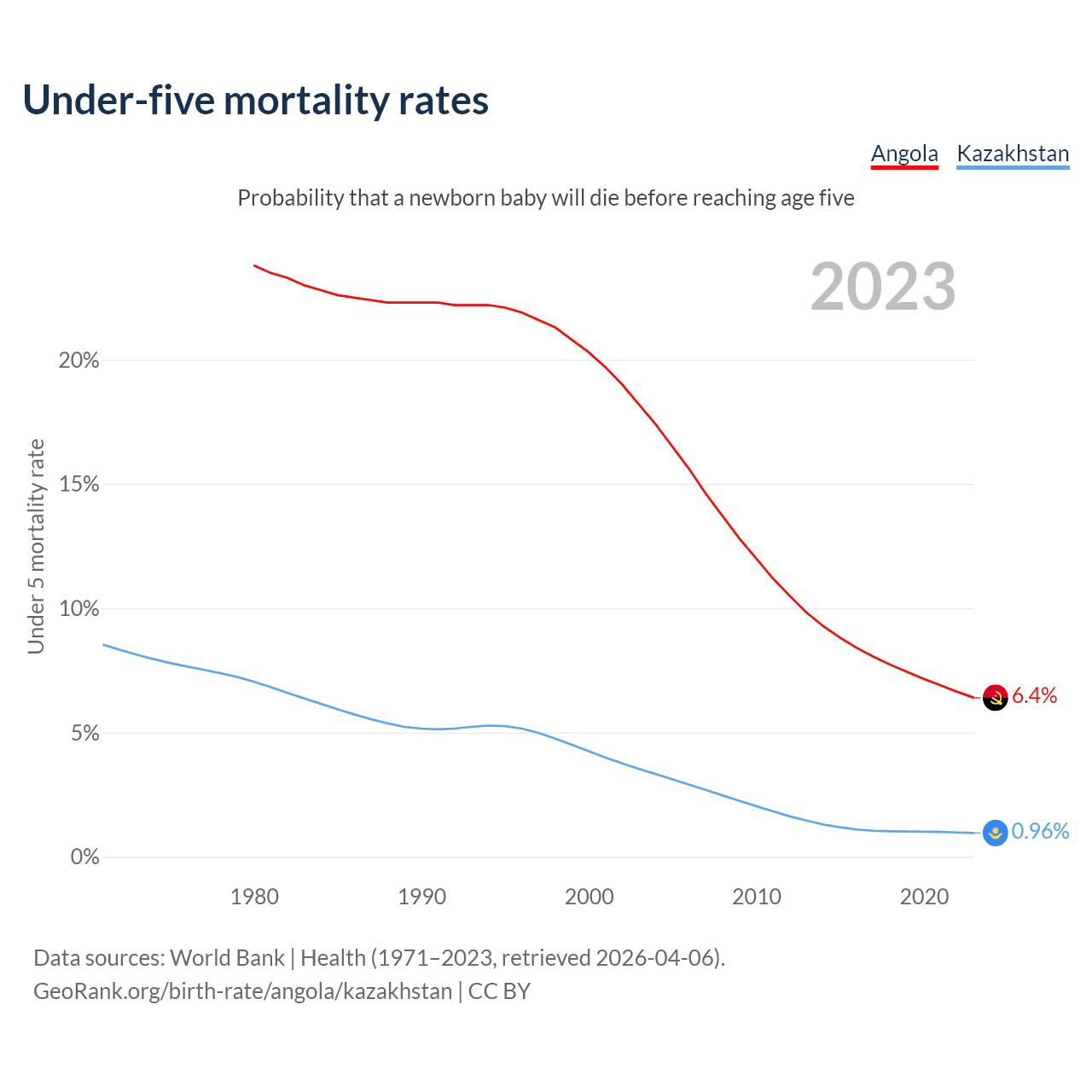 The chance that a newborn baby will die before reaching age five is 6.4% in Angola and 0.96% in Kazakhstan. Above is a chart with historical data on under-five mortality rates.