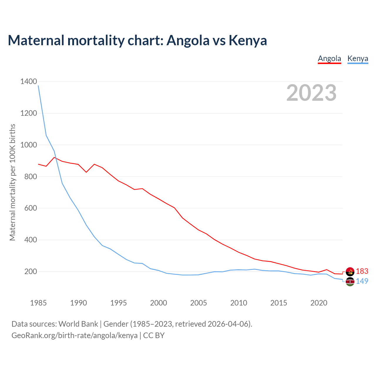 The maternal mortality rate, which is the probability of dying during childbirth or within 42 days of pregnancy termination, is 183 deaths per 100,000 live births in Angola, compared to 149 deaths in Kenya.