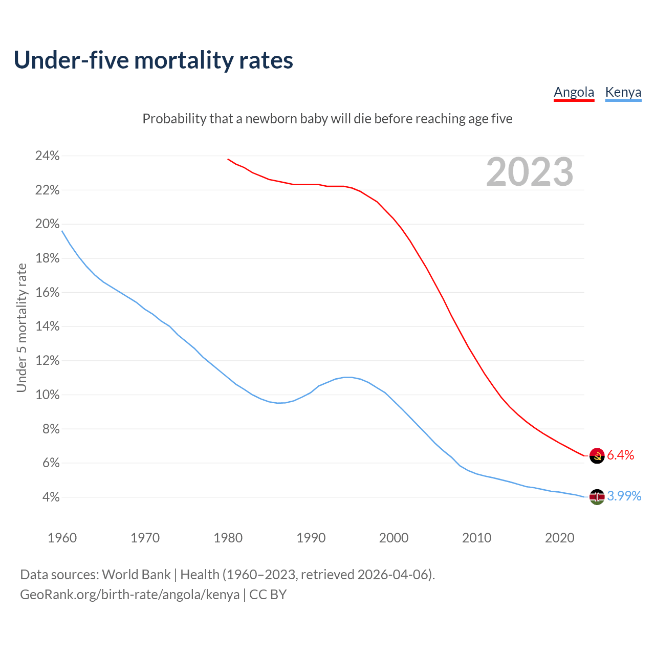 The chance that a newborn baby will die before reaching age five is 6.4% in Angola and 3.99% in Kenya. Above is a chart with historical data on under-five mortality rates.