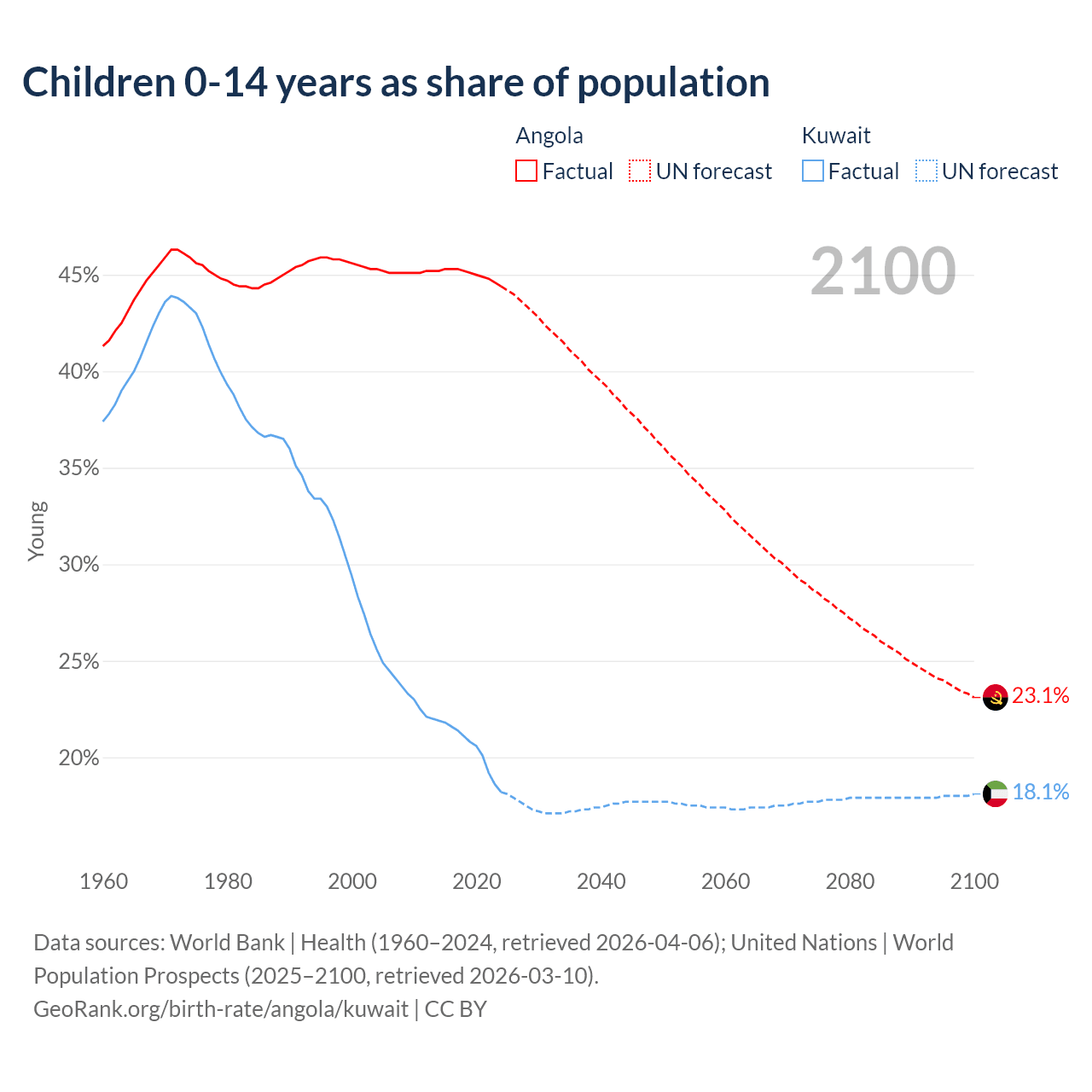 Angola has an annual birth rate of 37.6 births per 1,000 people, compared to 10.3 for Kuwait. The average number of children a woman is expected to have during her lifetime — the fertility rate, is 5.12 in Angola and 1.52 in Kuwait — 70.3% difference.