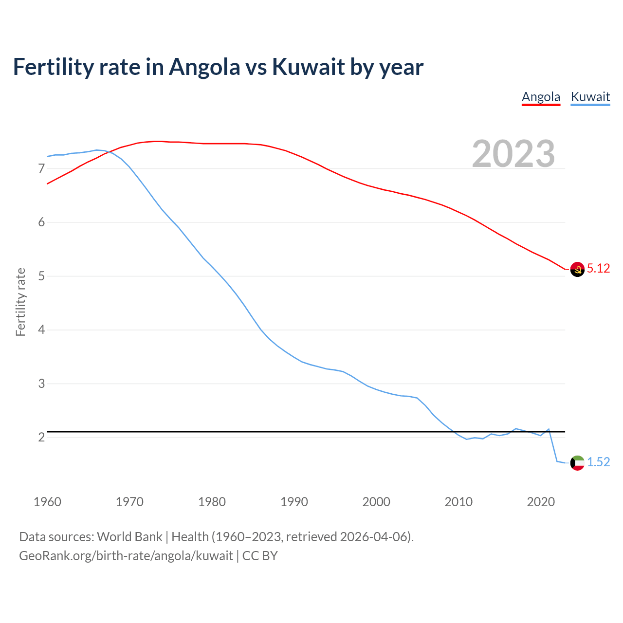 According to the latest available data on birth rates, the fertility rate in Angola was 5.12 children per woman in 2023, compared to 1.52 in Kuwait in 2023. The replacement level is considered to be 2.1 children per woman.