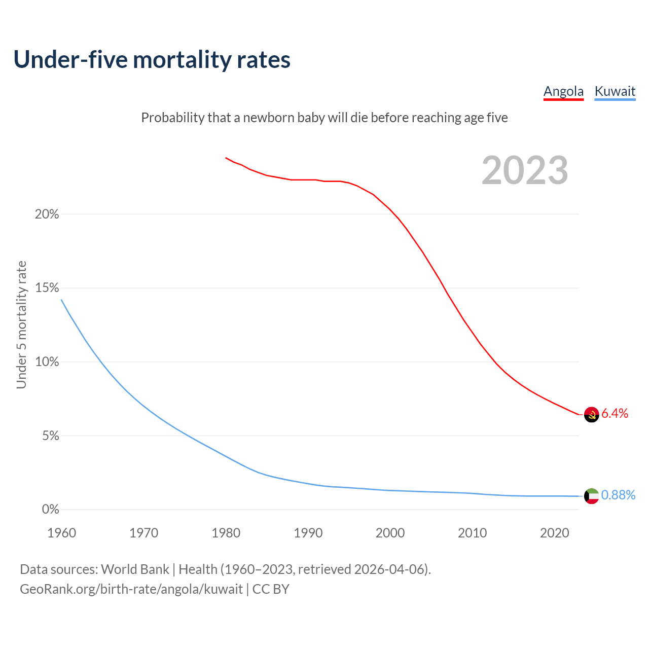 The chance that a newborn baby will die before reaching age five is 6.4% in Angola and 0.88% in Kuwait. Above is a chart with historical data on under-five mortality rates.