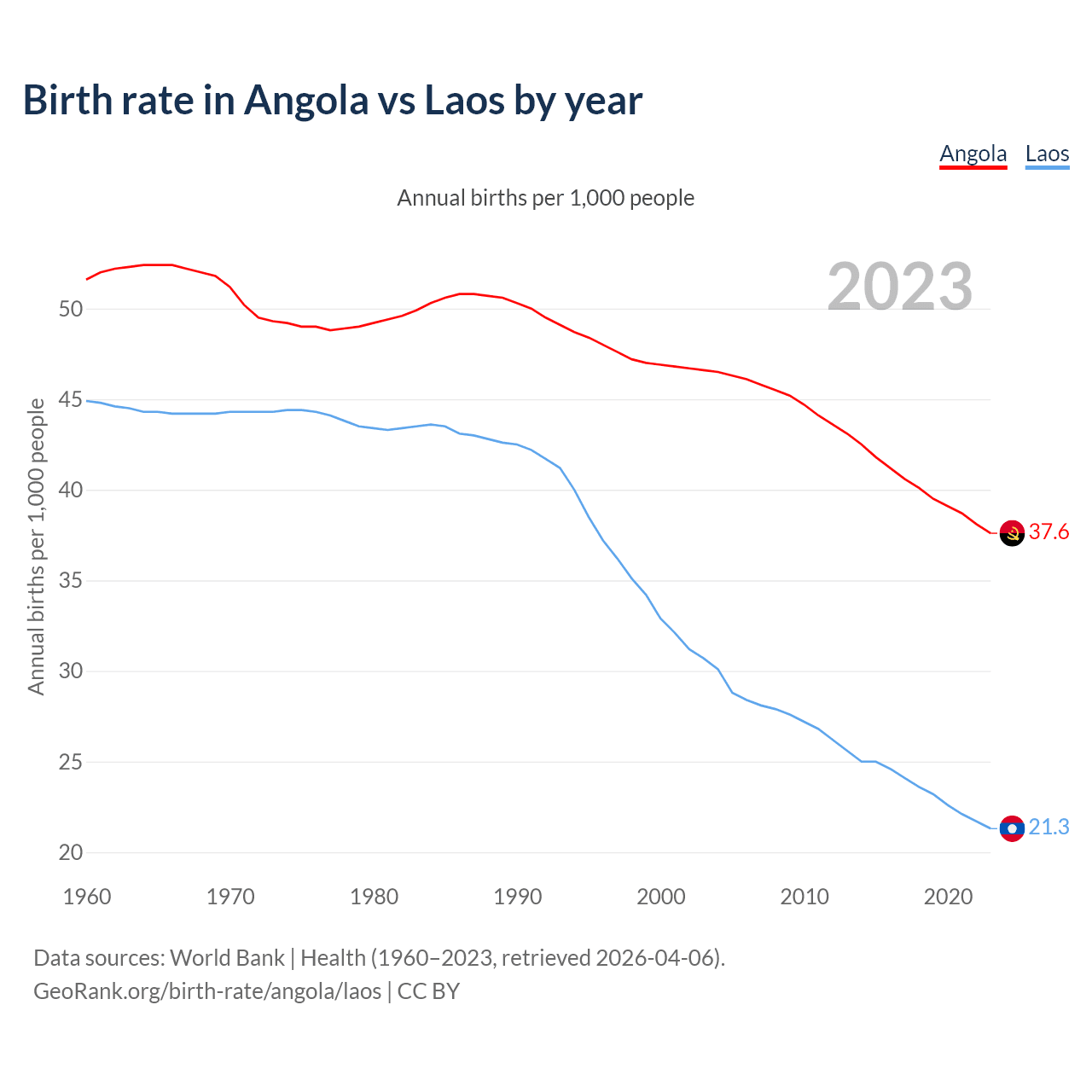 Angola has an annual birth rate of 37.6 births per 1,000 people, compared to 21.3 for Laos. The average number of children a woman is expected to have during her lifetime — the fertility rate, is 5.12 in Angola and 2.42 in Laos — 52.8% difference.