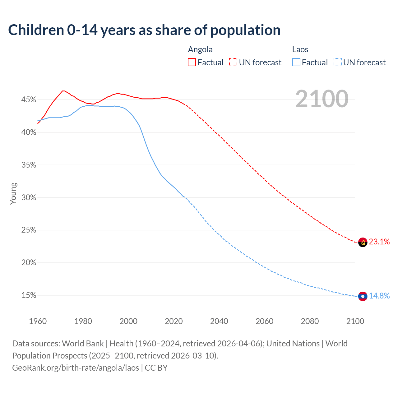 According to the latest available data on birth rates, the fertility rate in Angola was 5.12 children per woman in 2023, compared to 2.42 in Laos in 2023. The replacement level is considered to be 2.1 children per woman.