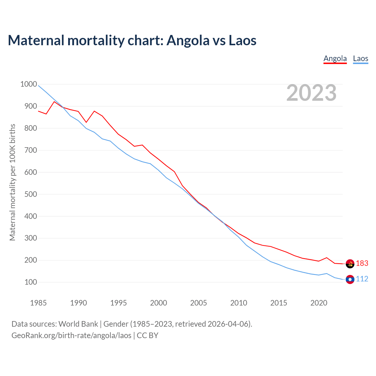 The maternal mortality rate, which is the probability of dying during childbirth or within 42 days of pregnancy termination, is 183 deaths per 100,000 live births in Angola, compared to 112 deaths in Laos.
