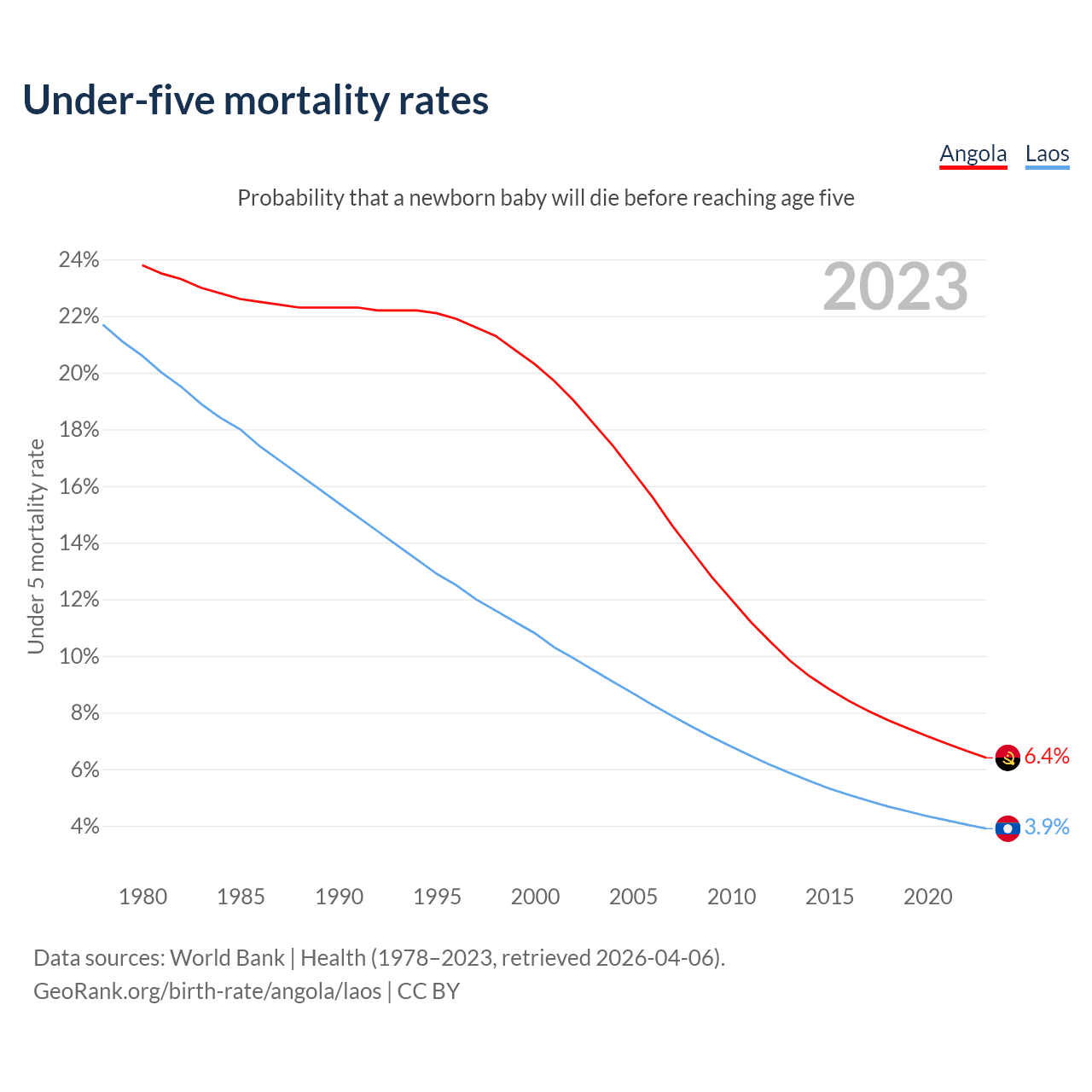 The chance that a newborn baby will die before reaching age five is 6.4% in Angola and 3.9% in Laos. Above is a chart with historical data on under-five mortality rates.