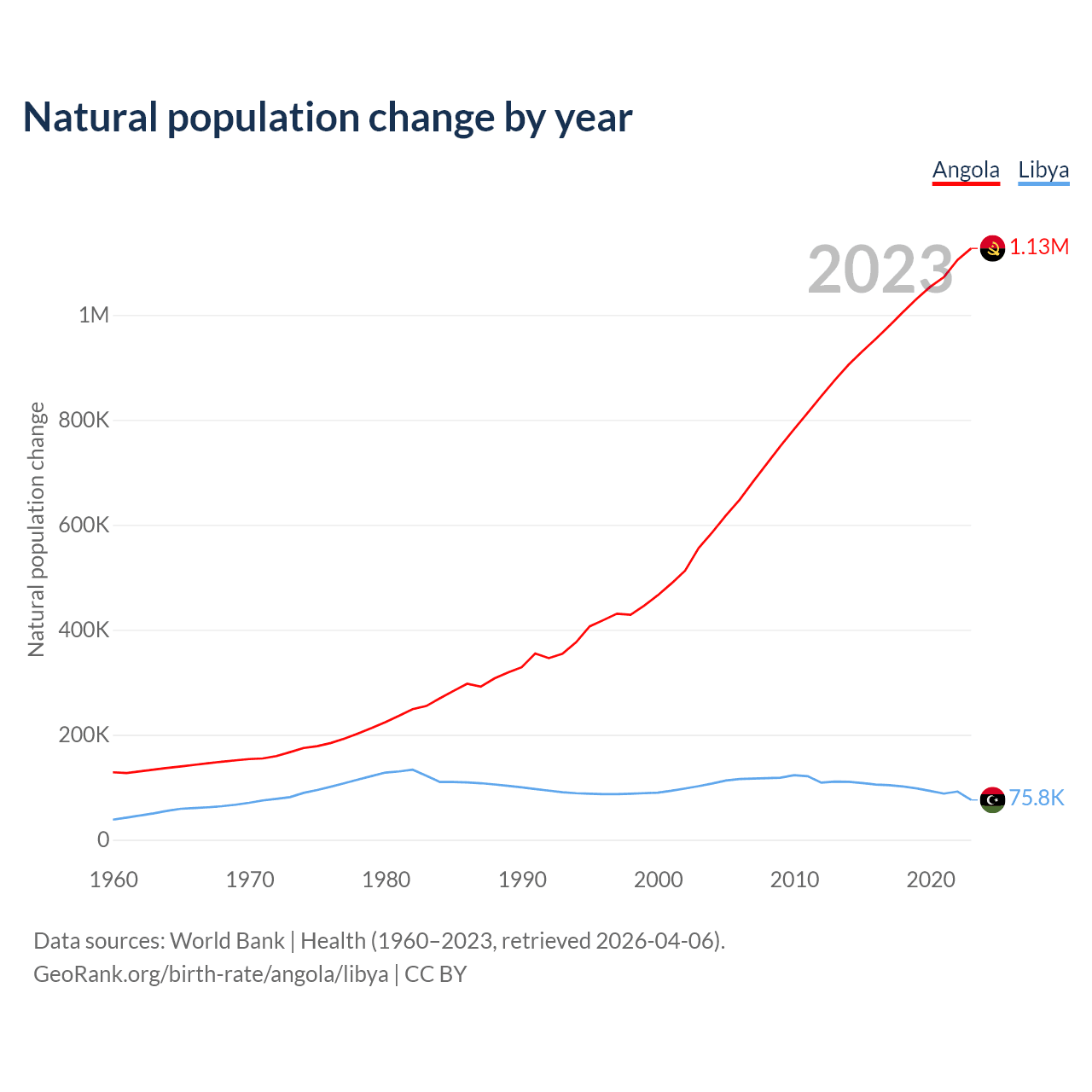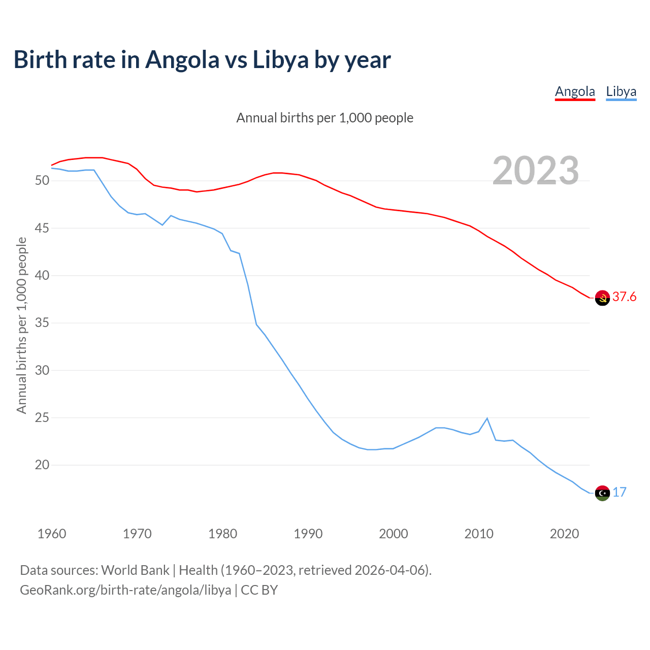 Angola has an annual birth rate of 37.6 births per 1,000 people, compared to 17 for Libya. The average number of children a woman is expected to have during her lifetime — the fertility rate, is 5.12 in Angola and 2.36 in Libya — 54% difference.
