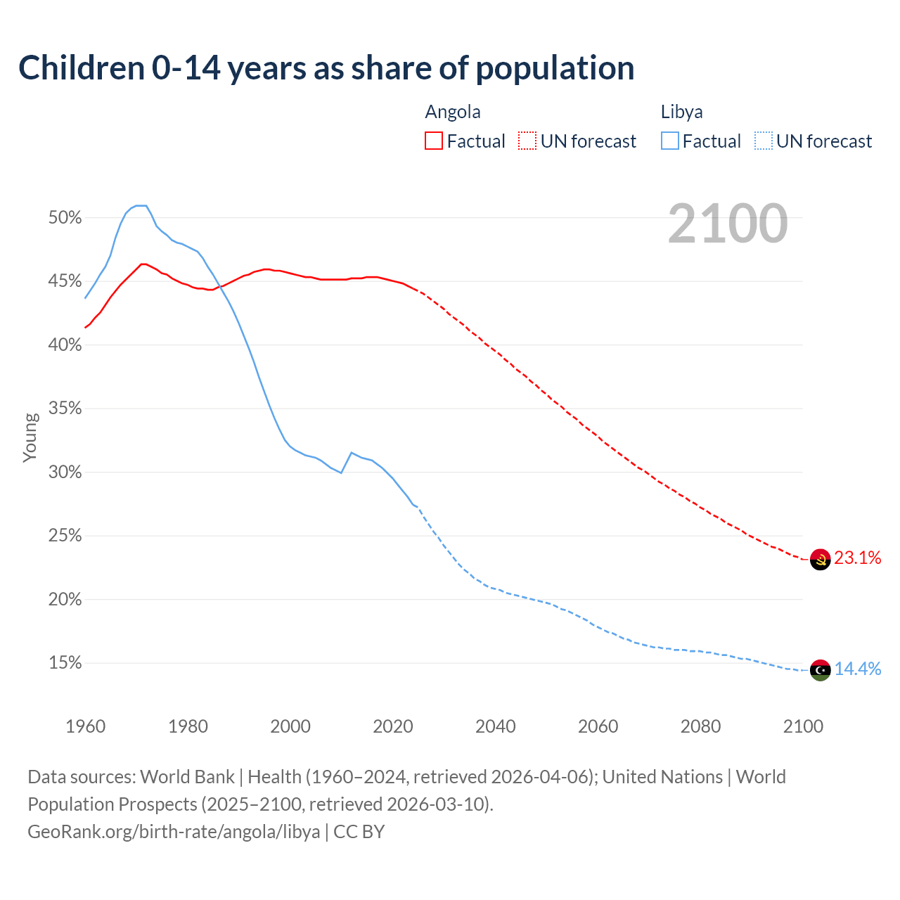 According to the latest available data on birth rates, the fertility rate in Angola was 5.12 children per woman in 2023, compared to 2.36 in Libya in 2023. The replacement level is considered to be 2.1 children per woman.
