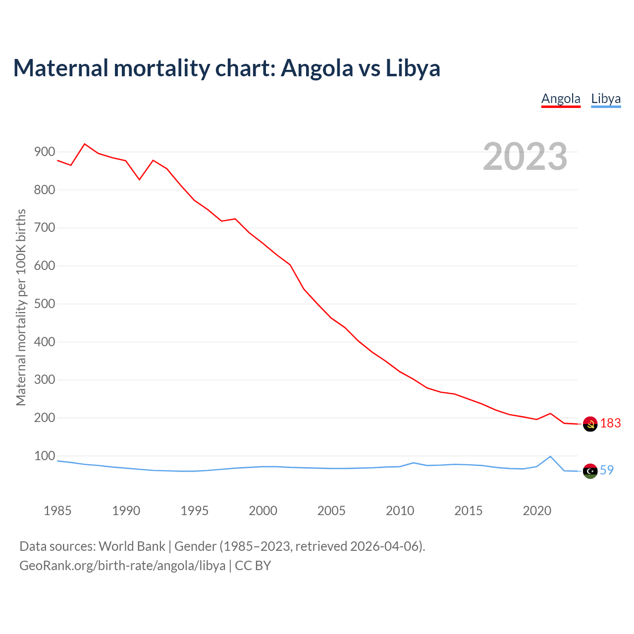 The maternal mortality rate, which is the probability of dying during childbirth or within 42 days of pregnancy termination, is 183 deaths per 100,000 live births in Angola, compared to 59 deaths in Libya.