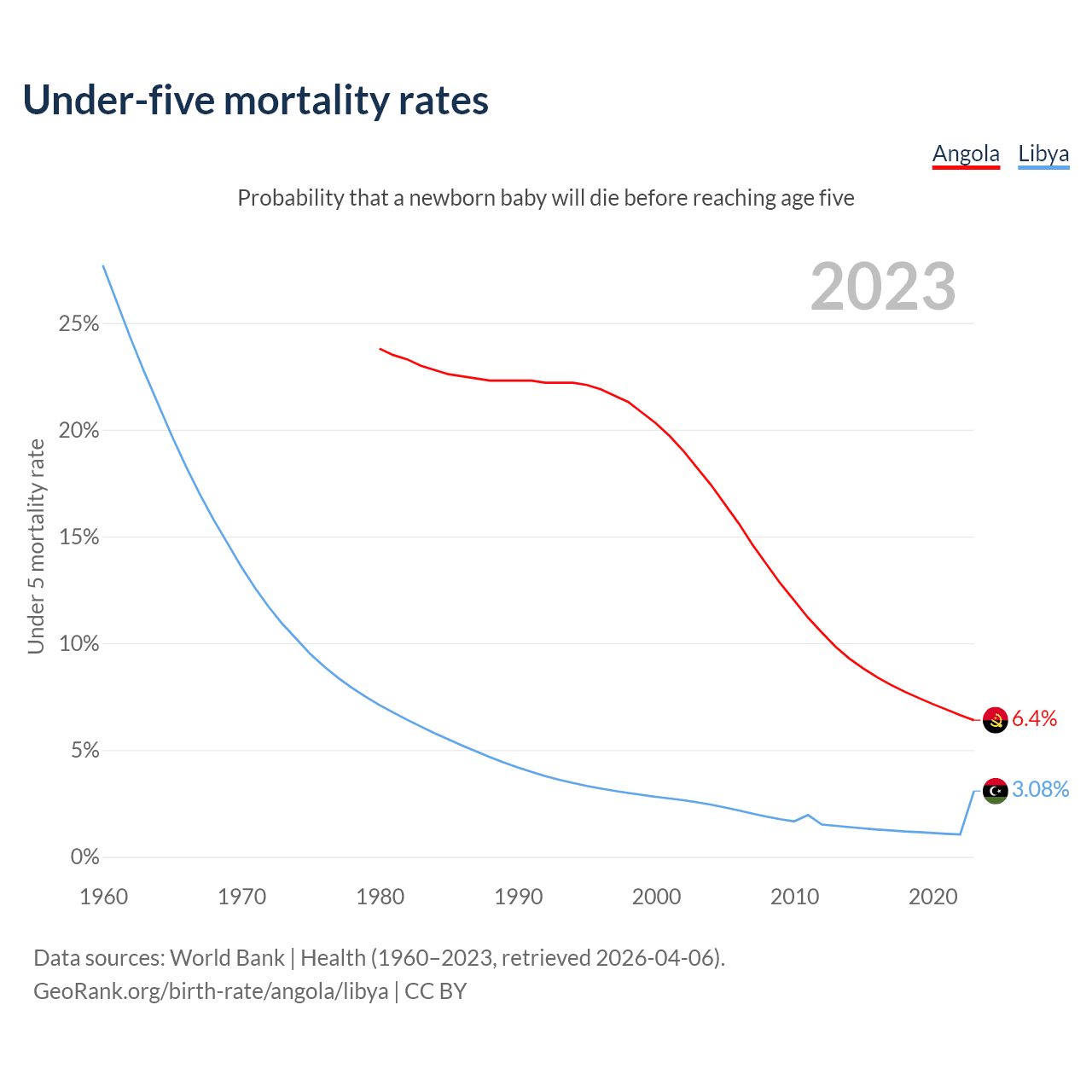 The chance that a newborn baby will die before reaching age five is 6.4% in Angola and 3.08% in Libya. Above is a chart with historical data on under-five mortality rates.