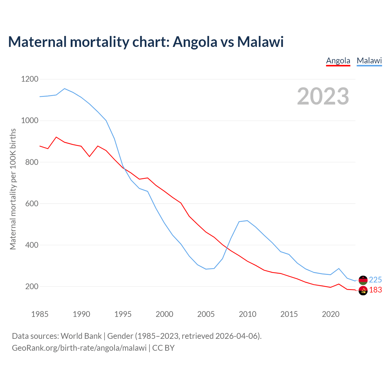 The maternal mortality rate, which is the probability of dying during childbirth or within 42 days of pregnancy termination, is 183 deaths per 100,000 live births in Angola, compared to 225 deaths in Malawi.