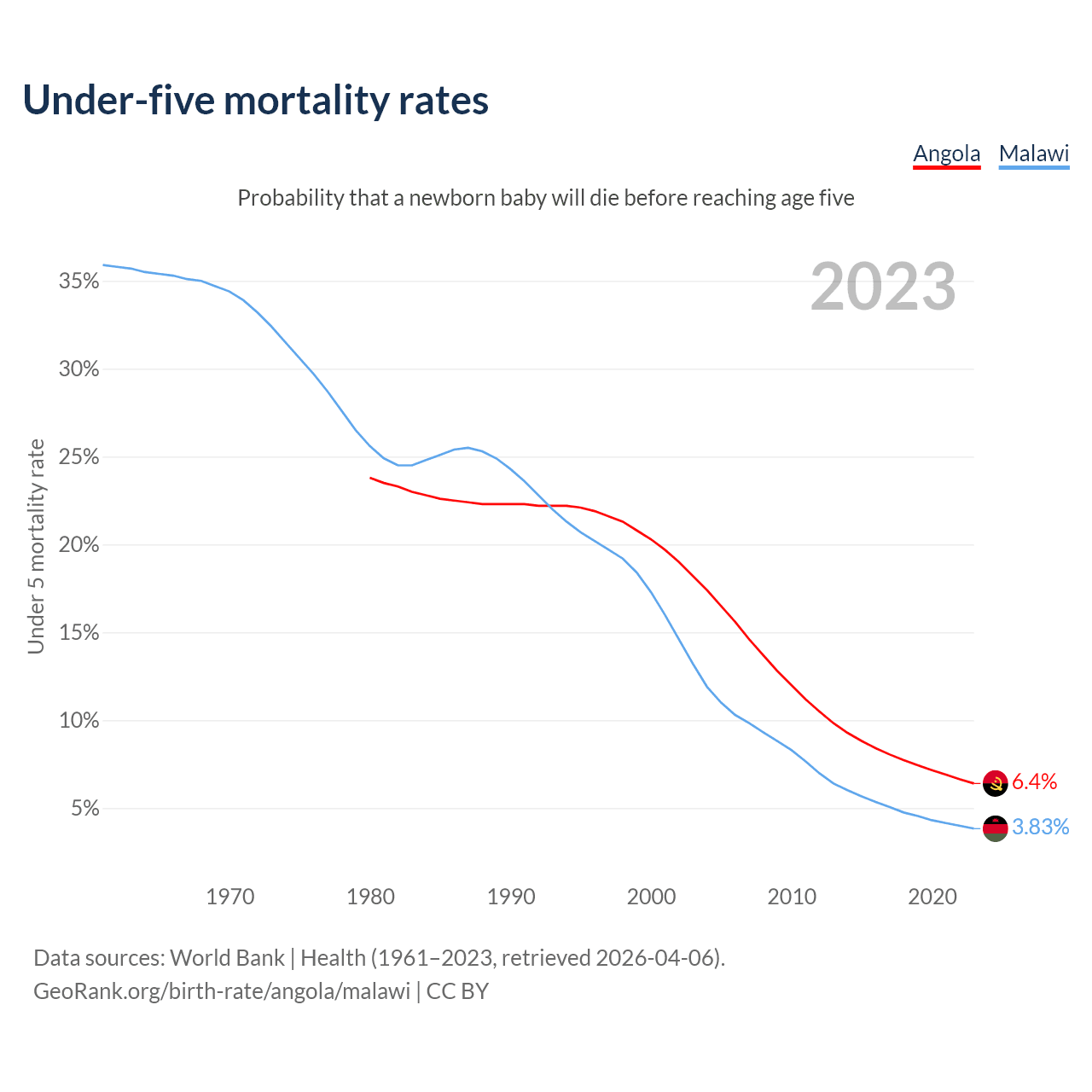 The chance that a newborn baby will die before reaching age five is 6.4% in Angola and 3.83% in Malawi. Above is a chart with historical data on under-five mortality rates.