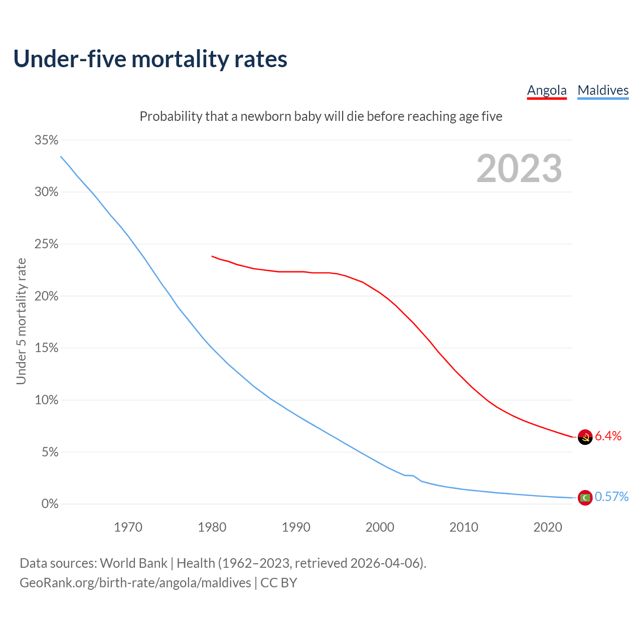 The chance that a newborn baby will die before reaching age five is 6.4% in Angola and 0.57% in Maldives. Above is a chart with historical data on under-five mortality rates.