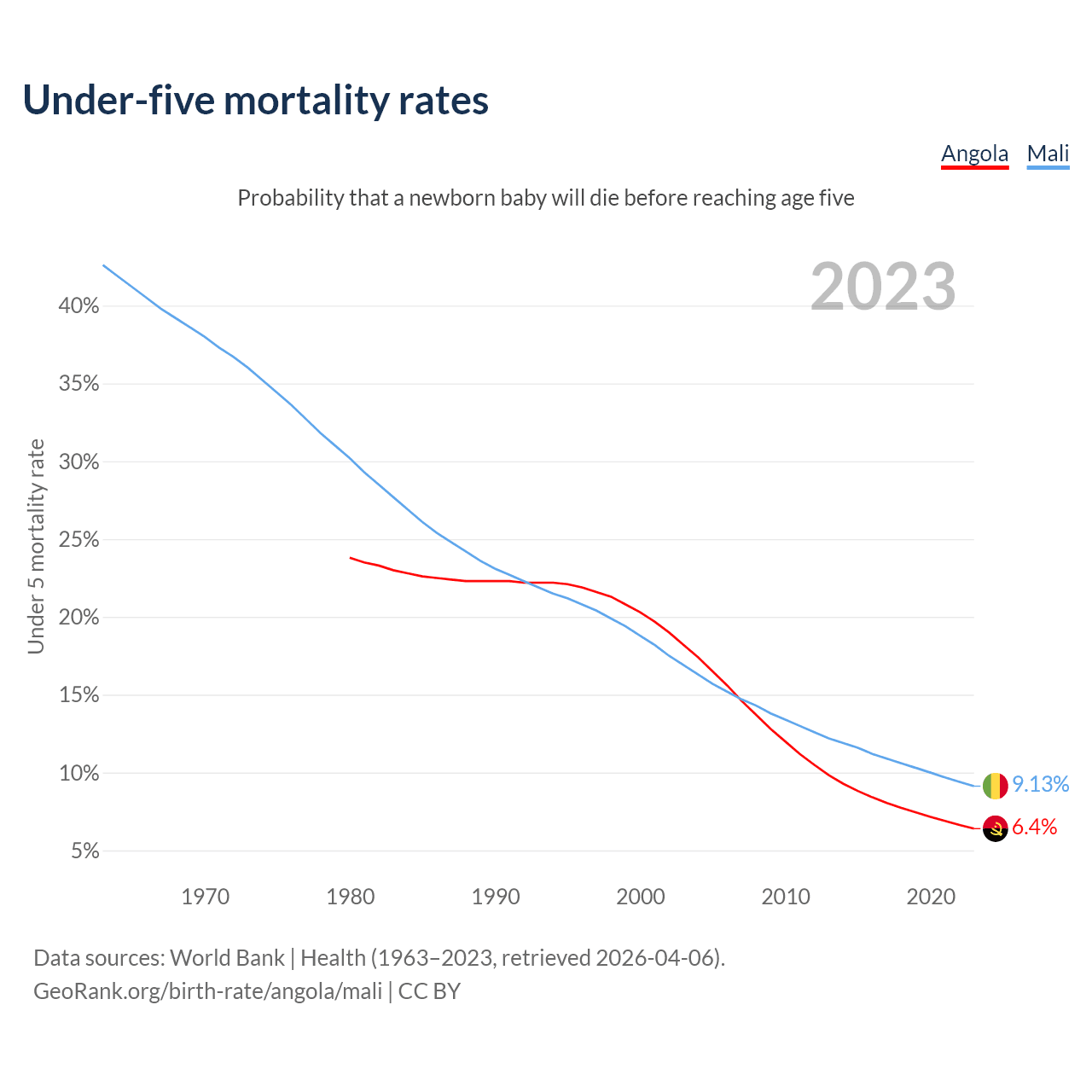 The chance that a newborn baby will die before reaching age five is 6.4% in Angola and 9.13% in Mali. Above is a chart with historical data on under-five mortality rates.