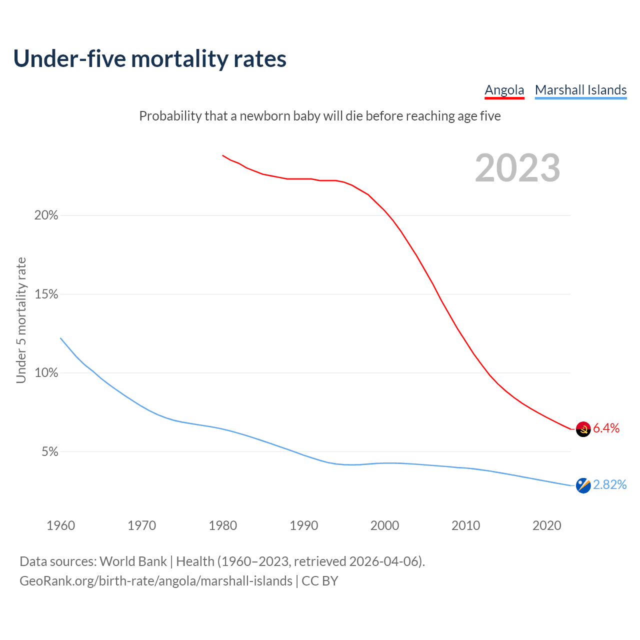 The chance that a newborn baby will die before reaching age five is 6.4% in Angola and 2.82% in the Marshall Islands. Above is a chart with historical data on under-five mortality rates.