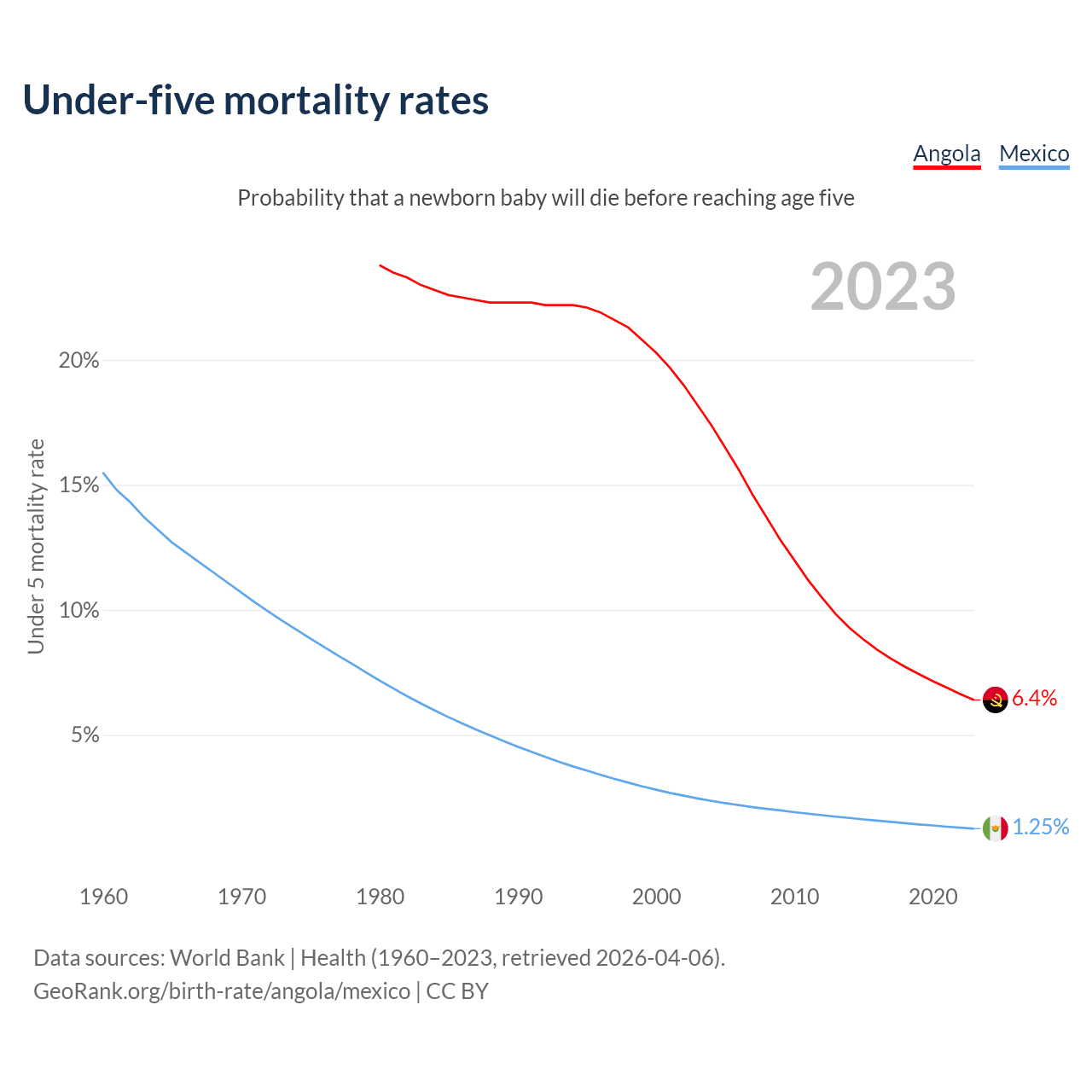 The chance that a newborn baby will die before reaching age five is 6.4% in Angola and 1.25% in Mexico. Above is a chart with historical data on under-five mortality rates.