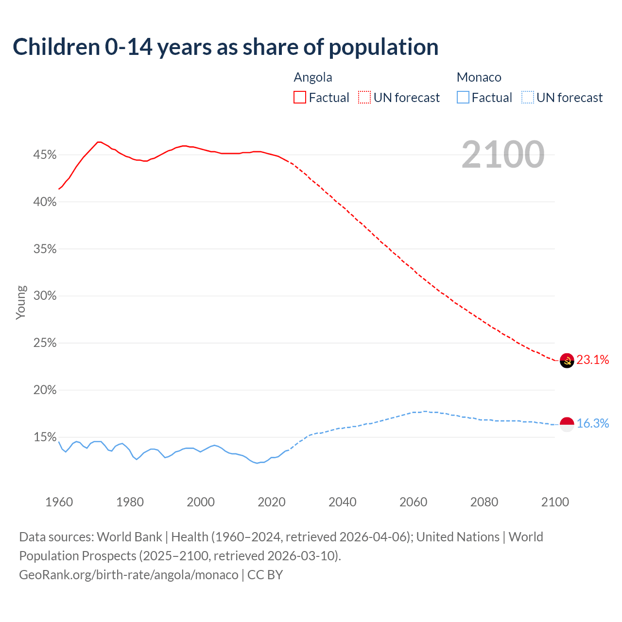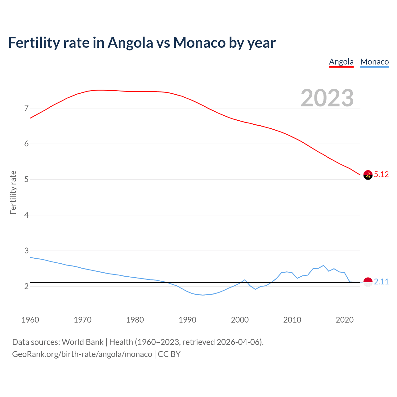 According to the latest available data on birth rates, the fertility rate in Angola was 5.12 children per woman in 2023, compared to 2.11 in Monaco in 2023. The replacement level is considered to be 2.1 children per woman.