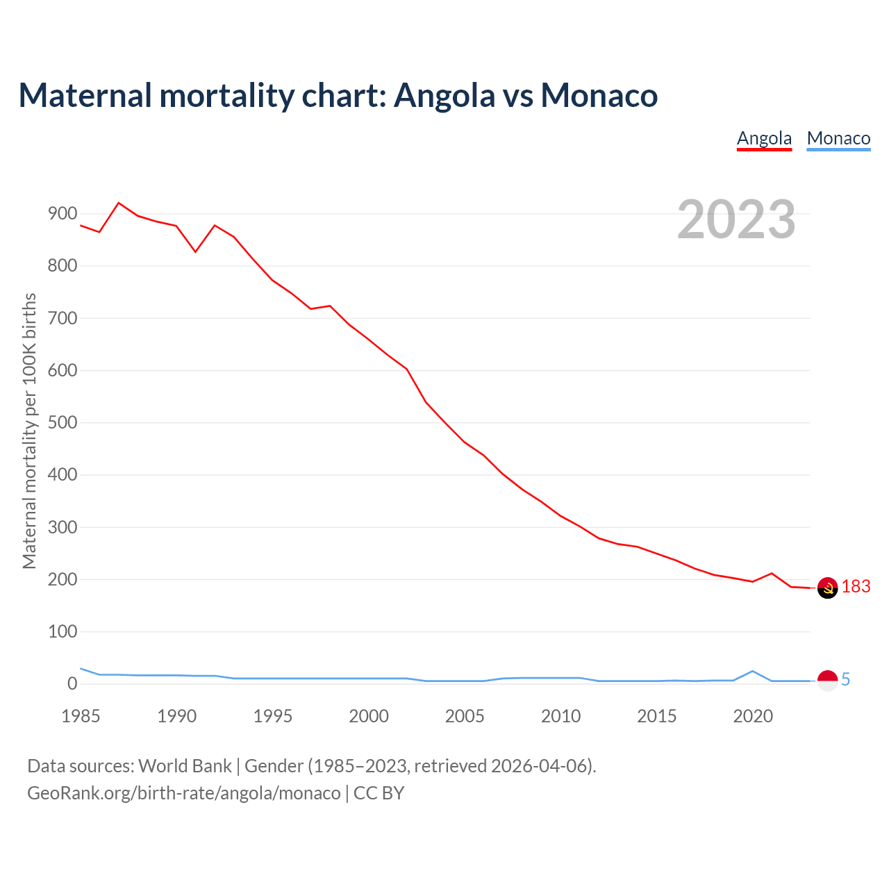 The maternal mortality rate, which is the probability of dying during childbirth or within 42 days of pregnancy termination, is 183 deaths per 100,000 live births in Angola, compared to 5 deaths in Monaco.
