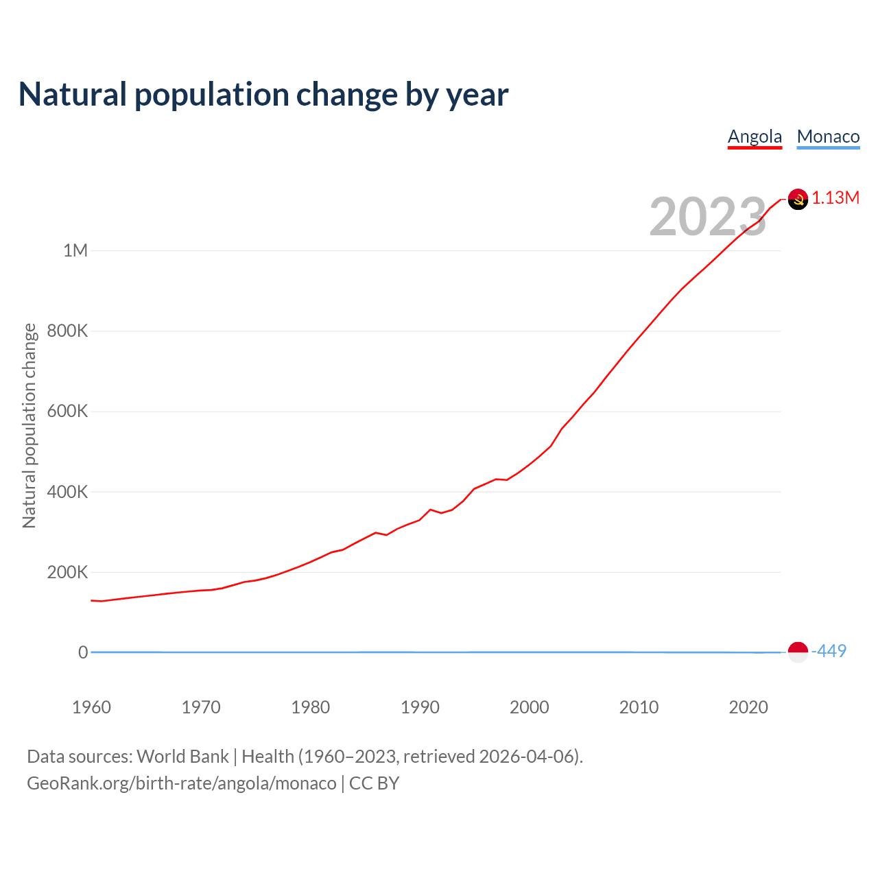 Angola has an annual birth rate of 37.6 births per 1,000 people, compared to 9.44 for Monaco. The average number of children a woman is expected to have during her lifetime — the fertility rate, is 5.12 in Angola and 2.11 in Monaco — 58.8% difference.