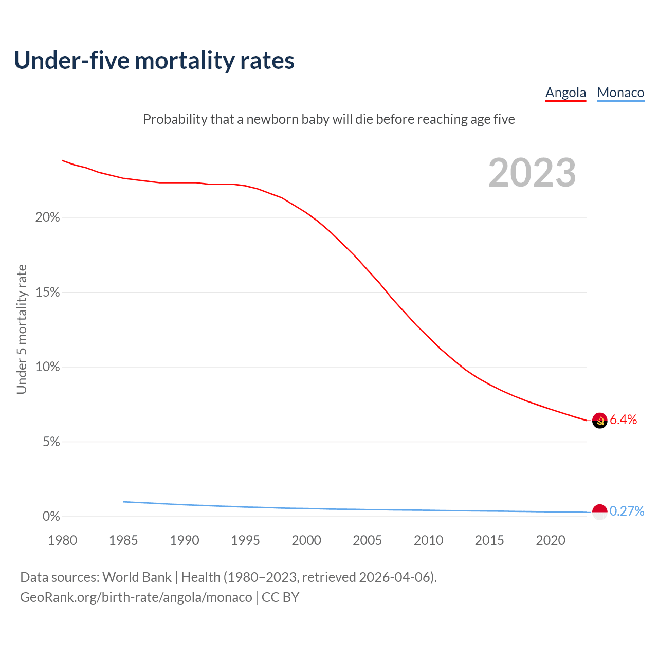 The chance that a newborn baby will die before reaching age five is 6.4% in Angola and 0.27% in Monaco. Above is a chart with historical data on under-five mortality rates.