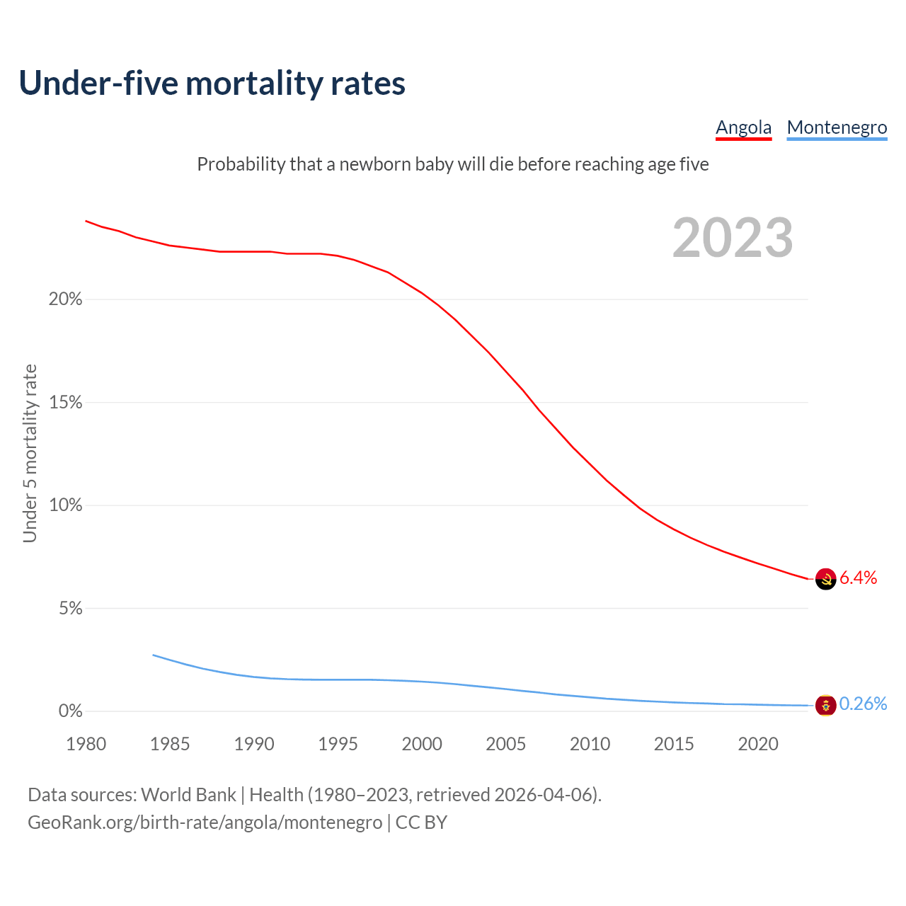 The chance that a newborn baby will die before reaching age five is 6.4% in Angola and 0.26% in Montenegro. Above is a chart with historical data on under-five mortality rates.