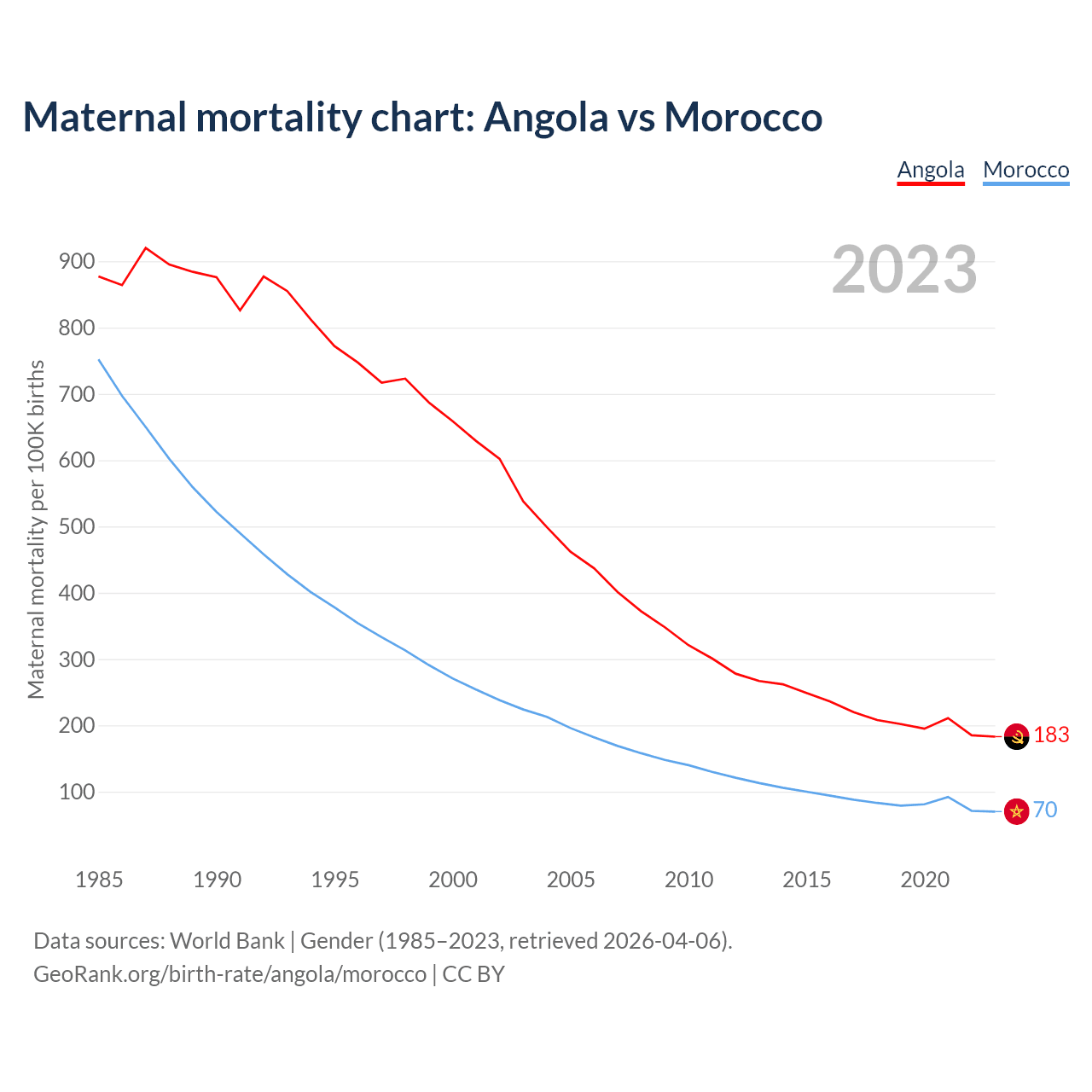 The maternal mortality rate, which is the probability of dying during childbirth or within 42 days of pregnancy termination, is 183 deaths per 100,000 live births in Angola, compared to 70 deaths in Morocco.