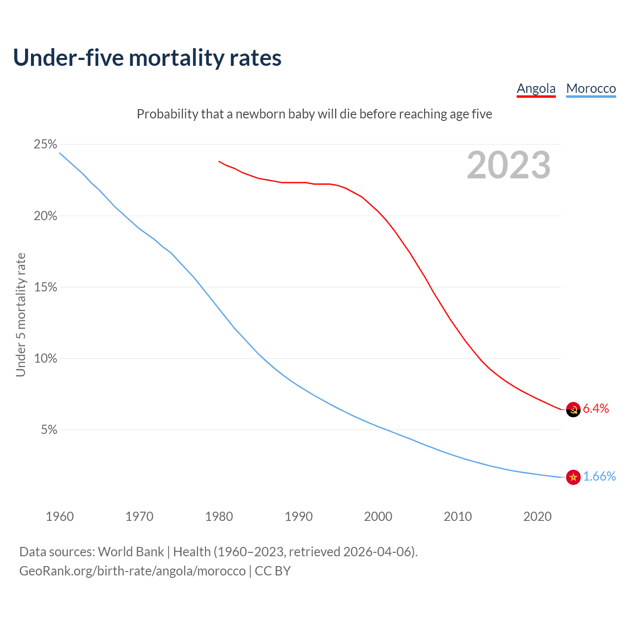 The chance that a newborn baby will die before reaching age five is 6.4% in Angola and 1.66% in Morocco. Above is a chart with historical data on under-five mortality rates.