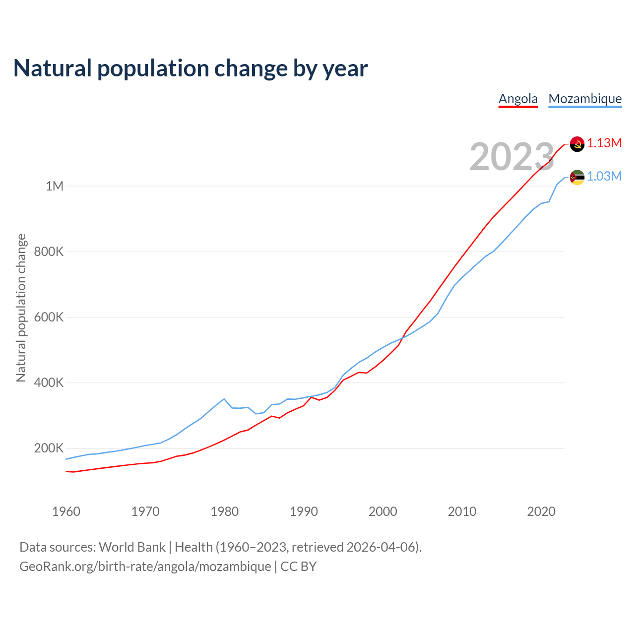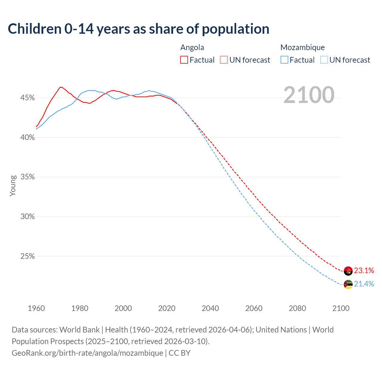 According to the latest available data on birth rates, the fertility rate in Angola was 5.12 children per woman in 2023, compared to 4.76 in Mozambique in 2023. The replacement level is considered to be 2.1 children per woman.