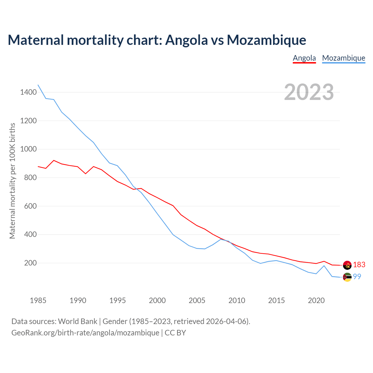 The maternal mortality rate, which is the probability of dying during childbirth or within 42 days of pregnancy termination, is 183 deaths per 100,000 live births in Angola, compared to 99 deaths in Mozambique.