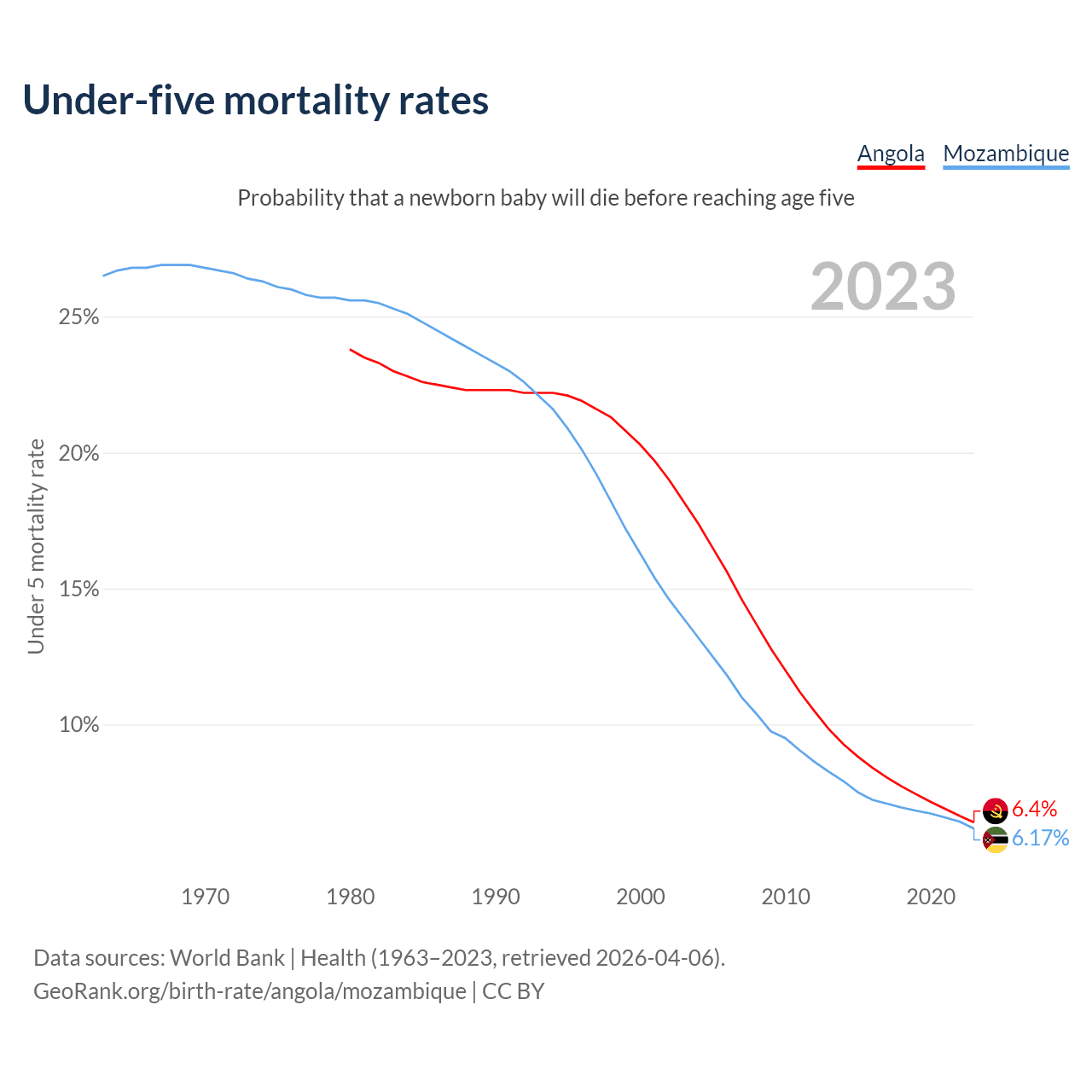 The chance that a newborn baby will die before reaching age five is 6.4% in Angola and 6.17% in Mozambique. Above is a chart with historical data on under-five mortality rates.