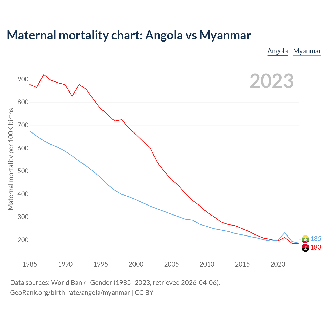 The maternal mortality rate, which is the probability of dying during childbirth or within 42 days of pregnancy termination, is 183 deaths per 100,000 live births in Angola, compared to 185 deaths in Myanmar.