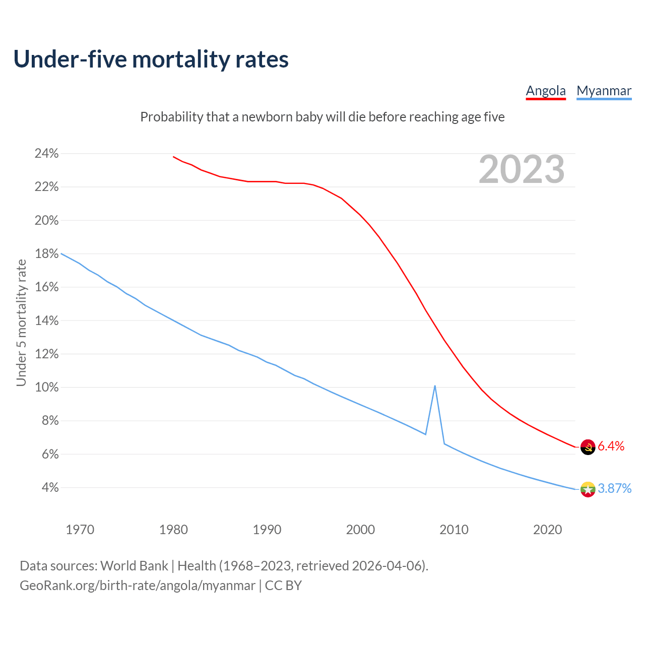The chance that a newborn baby will die before reaching age five is 6.4% in Angola and 3.87% in Myanmar. Above is a chart with historical data on under-five mortality rates.