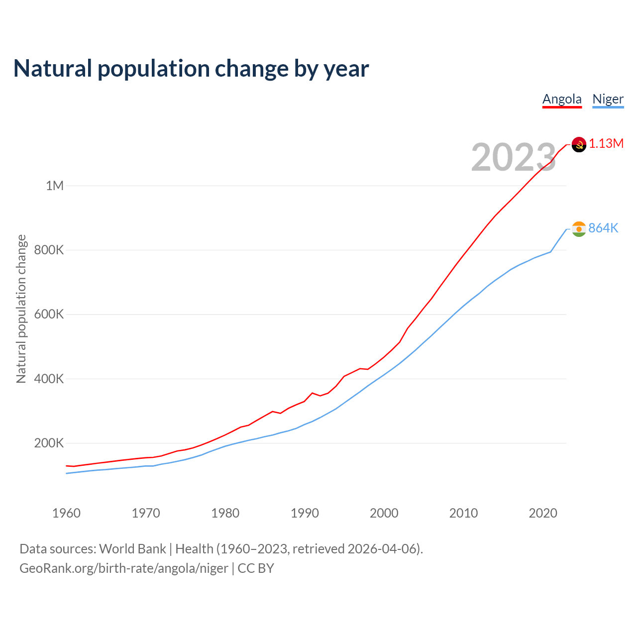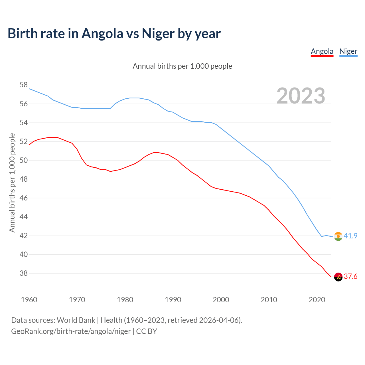 Angola has an annual birth rate of 37.6 births per 1,000 people, compared to 41.9 for Niger. The average number of children a woman is expected to have during her lifetime — the fertility rate, is 5.12 in Angola and 6.06 in Niger — 18.3% difference.
