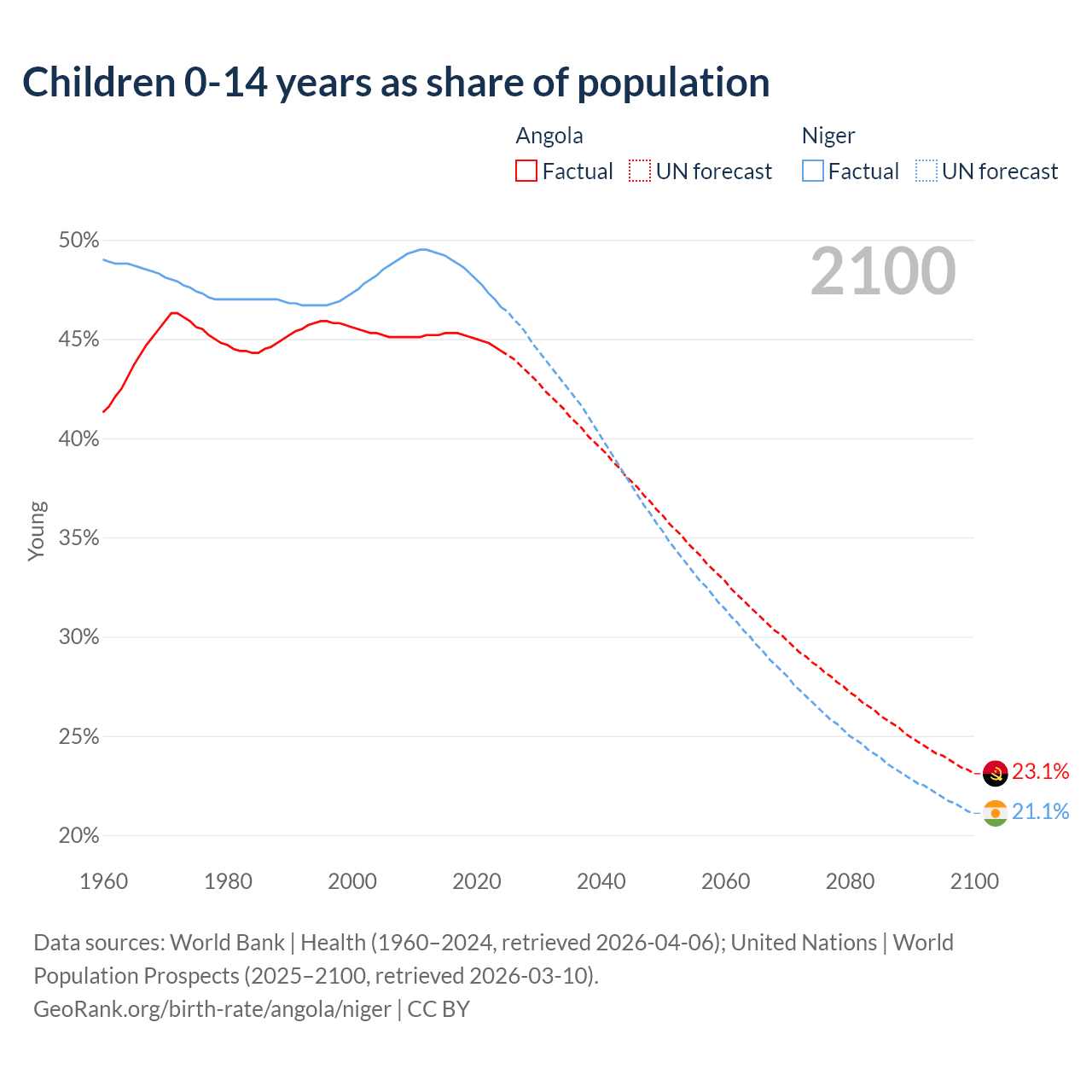 According to the latest available data on birth rates, the fertility rate in Angola was 5.12 children per woman in 2023, compared to 6.06 in Niger in 2023. The replacement level is considered to be 2.1 children per woman.