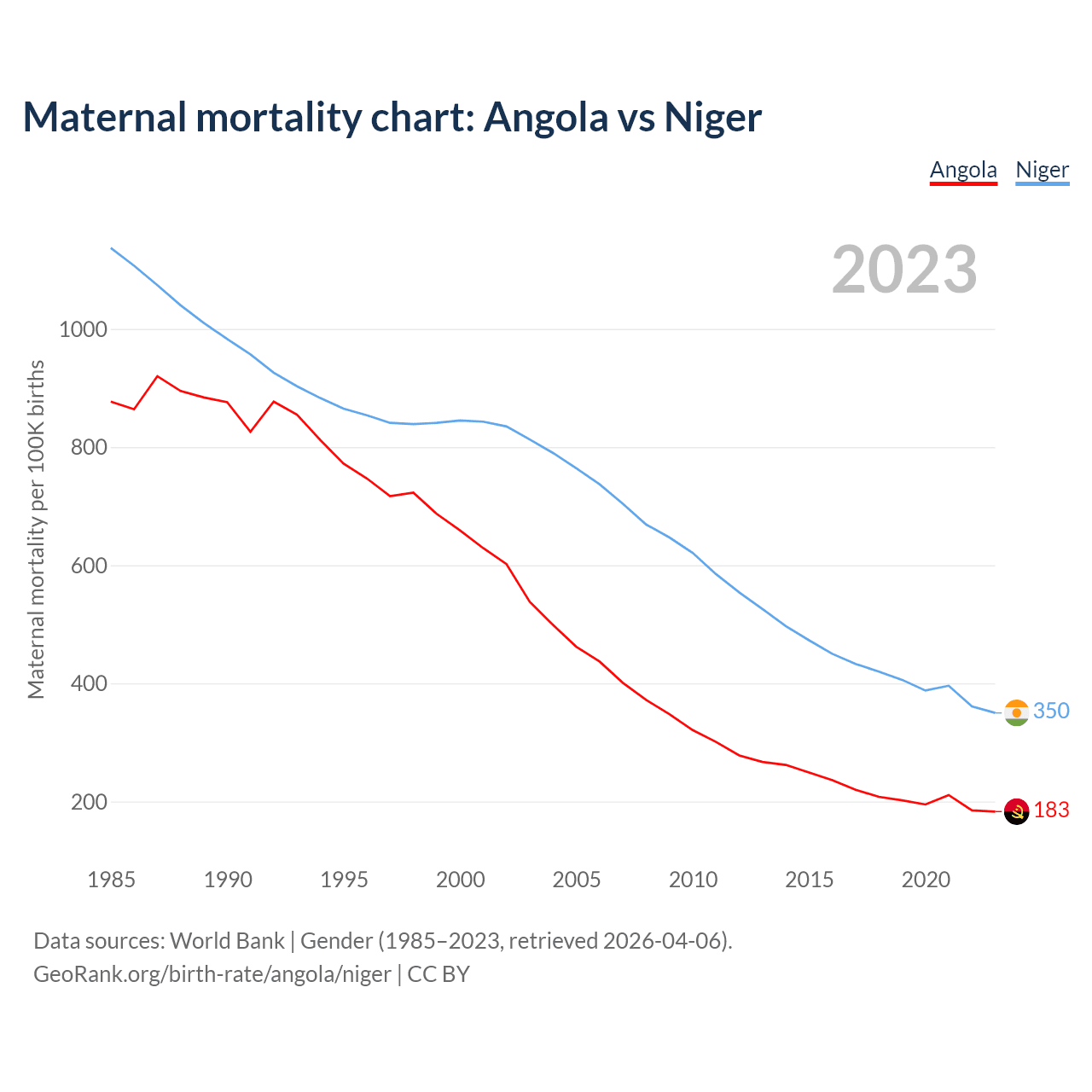 The maternal mortality rate, which is the probability of dying during childbirth or within 42 days of pregnancy termination, is 183 deaths per 100,000 live births in Angola, compared to 350 deaths in Niger.