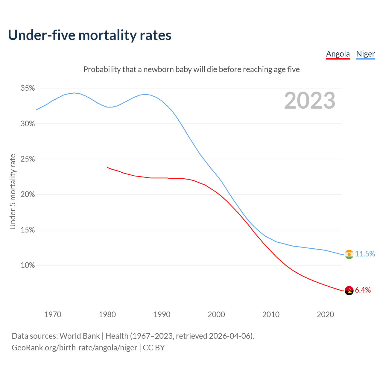 The chance that a newborn baby will die before reaching age five is 6.4% in Angola and 11.5% in Niger. Above is a chart with historical data on under-five mortality rates.