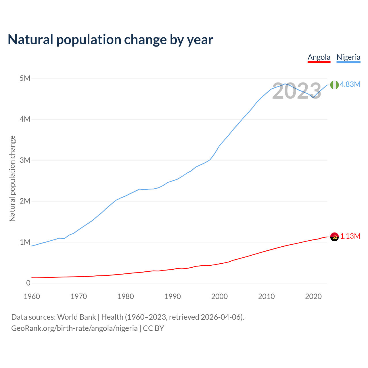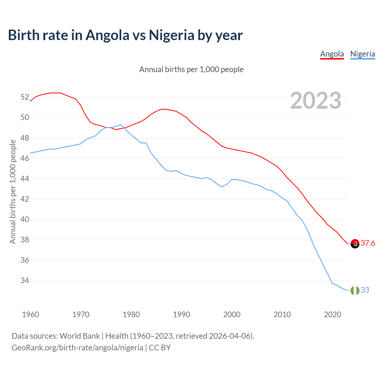 Angola has an annual birth rate of 37.6 births per 1,000 people, compared to 33 for Nigeria. The average number of children a woman is expected to have during her lifetime — the fertility rate, is 5.12 in Angola and 4.48 in Nigeria — 12.5% difference.