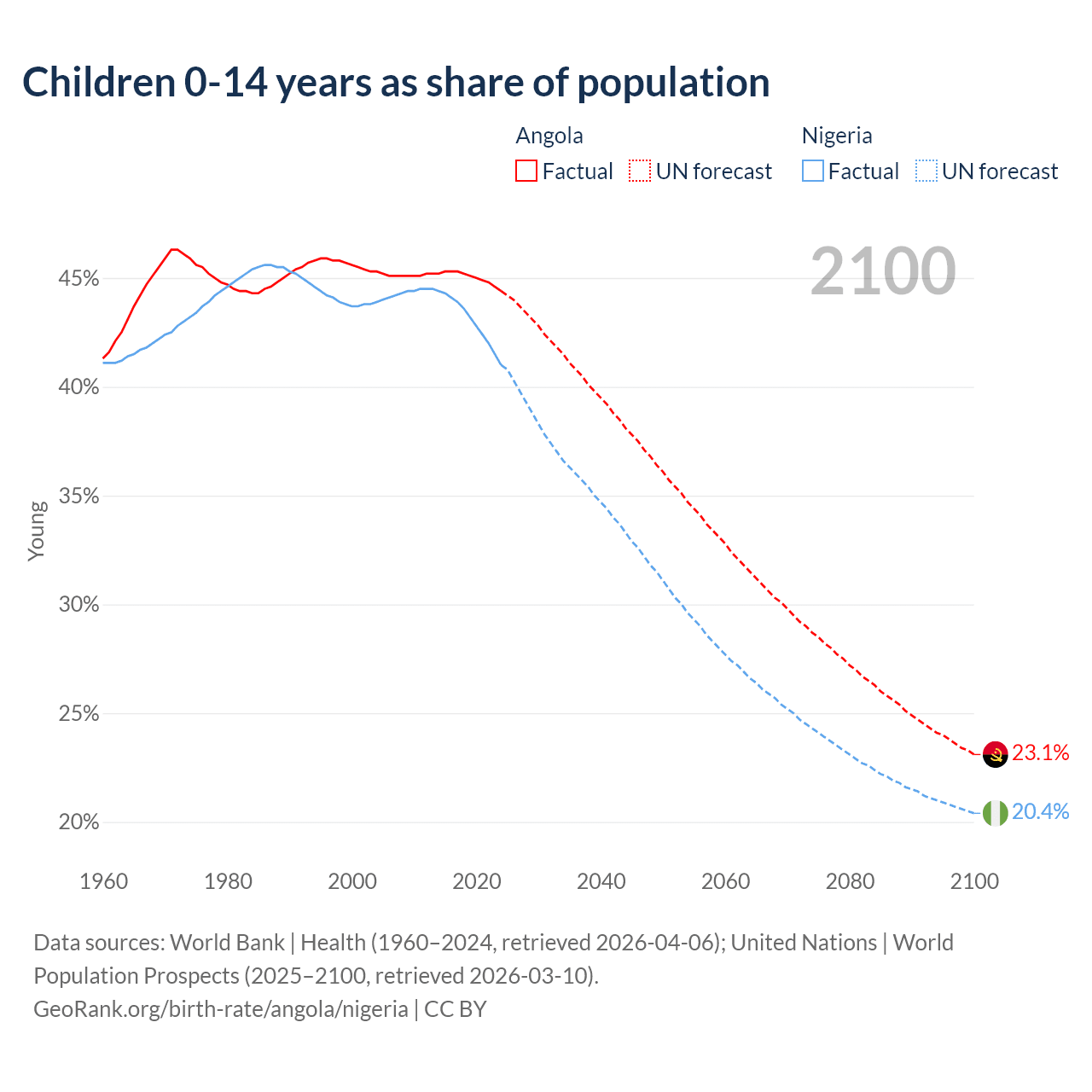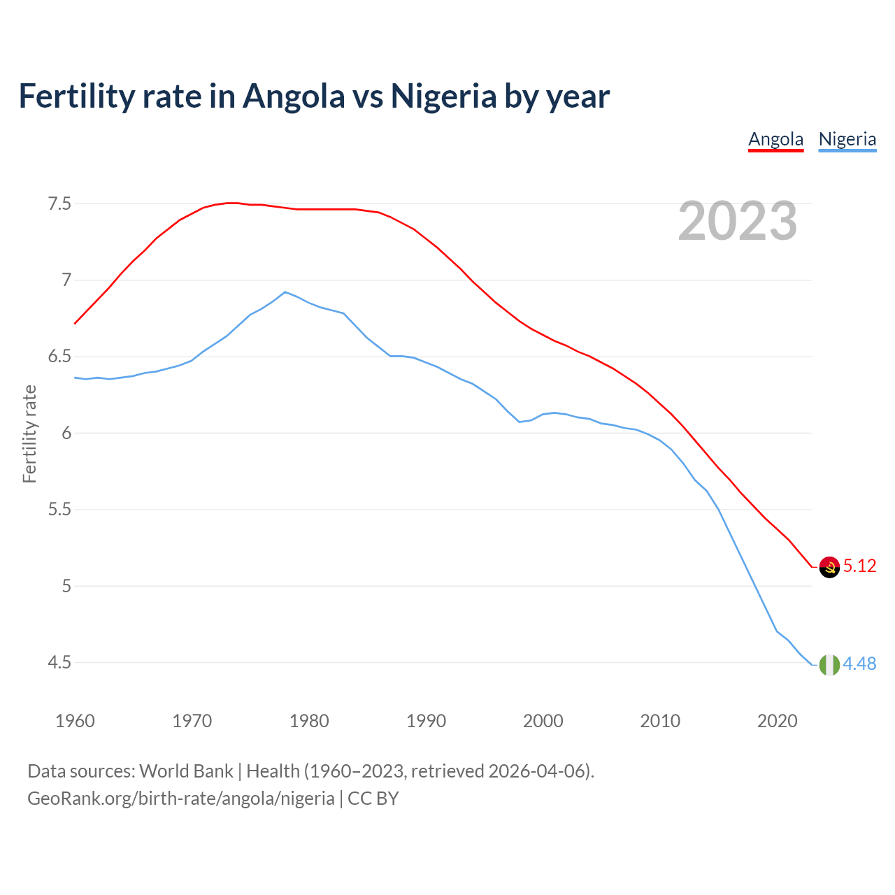 According to the latest available data on birth rates, the fertility rate in Angola was 5.12 children per woman in 2023, compared to 4.48 in Nigeria in 2023. The replacement level is considered to be 2.1 children per woman.