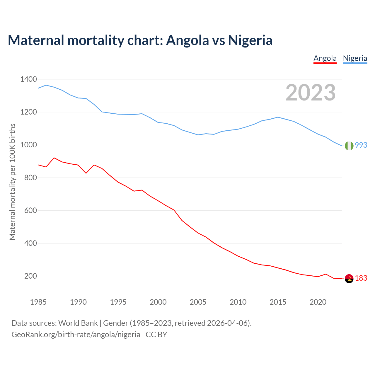 The maternal mortality rate, which is the probability of dying during childbirth or within 42 days of pregnancy termination, is 183 deaths per 100,000 live births in Angola, compared to 993 deaths in Nigeria.