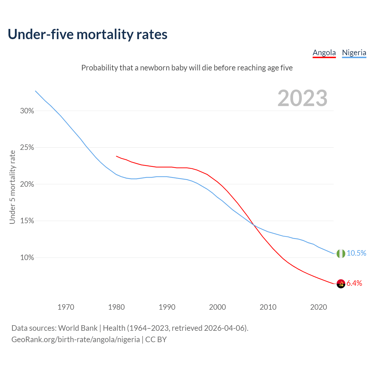 The chance that a newborn baby will die before reaching age five is 6.4% in Angola and 10.5% in Nigeria. Above is a chart with historical data on under-five mortality rates.