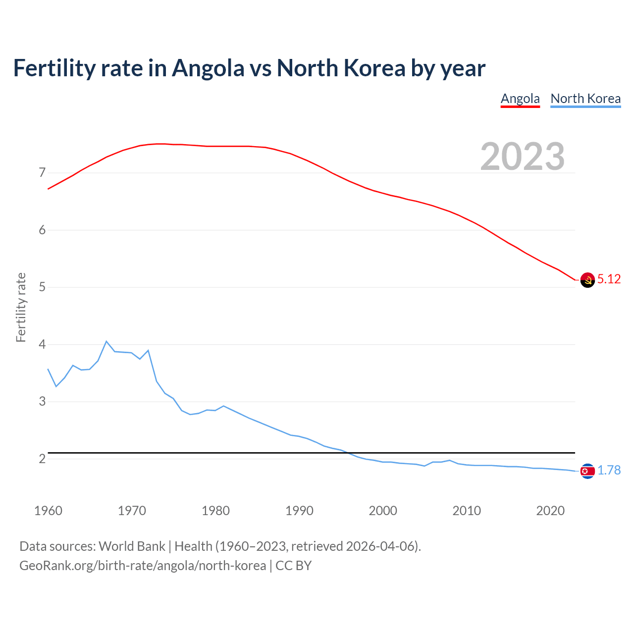 1960 vs 2023, the fertility rate has decreased by 23.6% in Angola and by 50.1% in North Korea — in 1960, it was 6.71 and 3.57, respectively.
