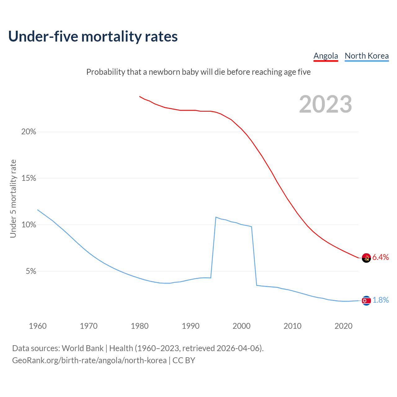 The chance that a newborn baby will die before reaching age five is 6.4% in Angola and 1.8% in North Korea. Above is a chart with historical data on under-five mortality rates.