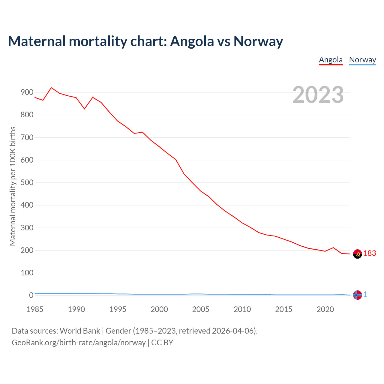 The maternal mortality rate, which is the probability of dying during childbirth or within 42 days of pregnancy termination, is 183 deaths per 100,000 live births in Angola, compared to 1 deaths in Norway.