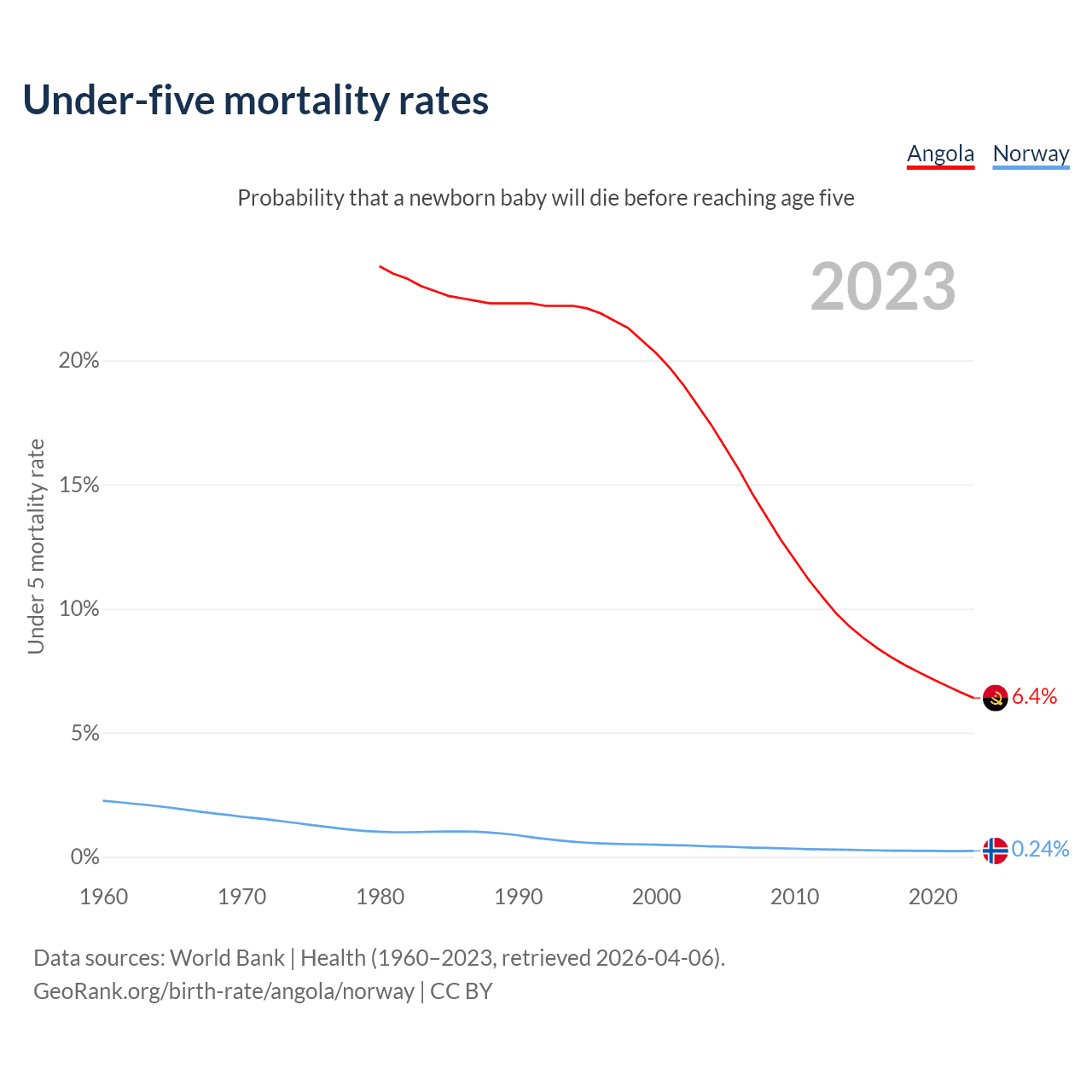 The chance that a newborn baby will die before reaching age five is 6.4% in Angola and 0.24% in Norway. Above is a chart with historical data on under-five mortality rates.