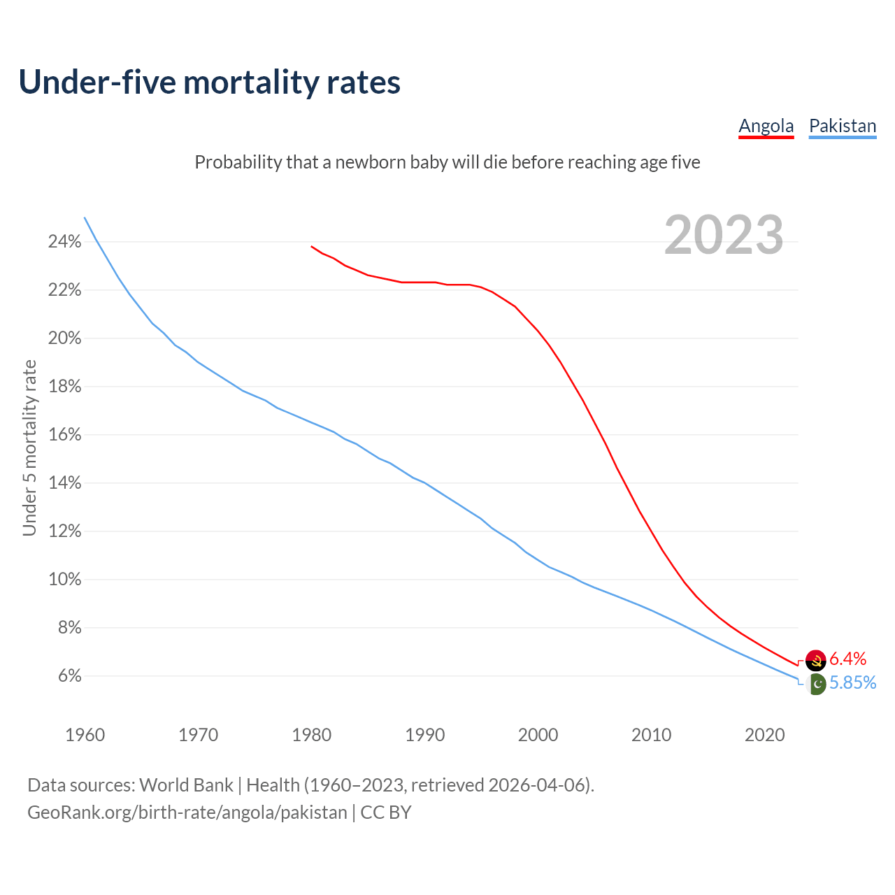 The chance that a newborn baby will die before reaching age five is 6.4% in Angola and 5.85% in Pakistan. Above is a chart with historical data on under-five mortality rates.