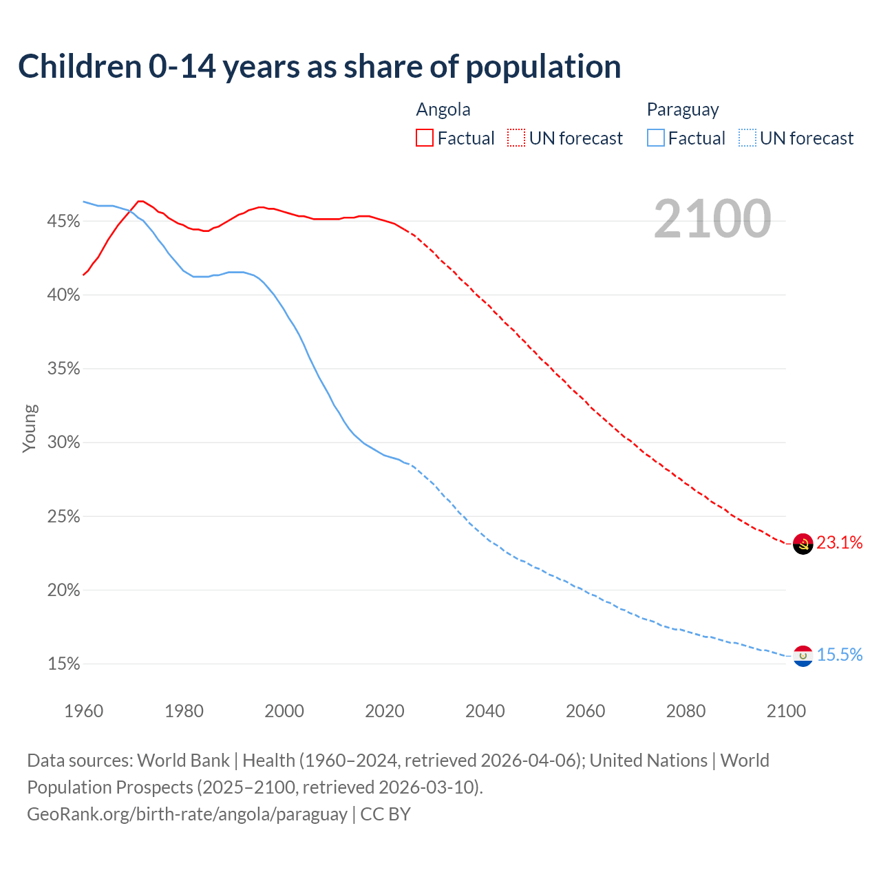 According to the latest available data on birth rates, the fertility rate in Angola was 5.12 children per woman in 2023, compared to 2.42 in Paraguay in 2023. The replacement level is considered to be 2.1 children per woman.