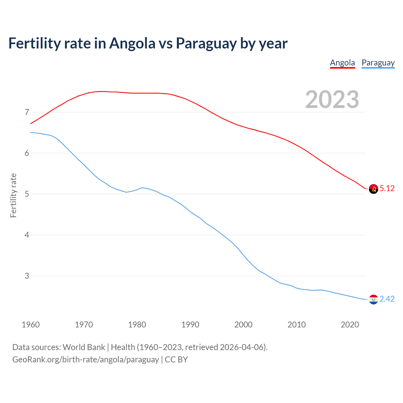 1960 vs 2023, the fertility rate has decreased by 23.6% in Angola and by 62.7% in Paraguay — in 1960, it was 6.71 and 6.5, respectively.