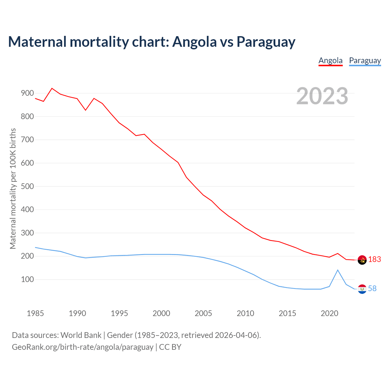 The maternal mortality rate, which is the probability of dying during childbirth or within 42 days of pregnancy termination, is 183 deaths per 100,000 live births in Angola, compared to 58 deaths in Paraguay.