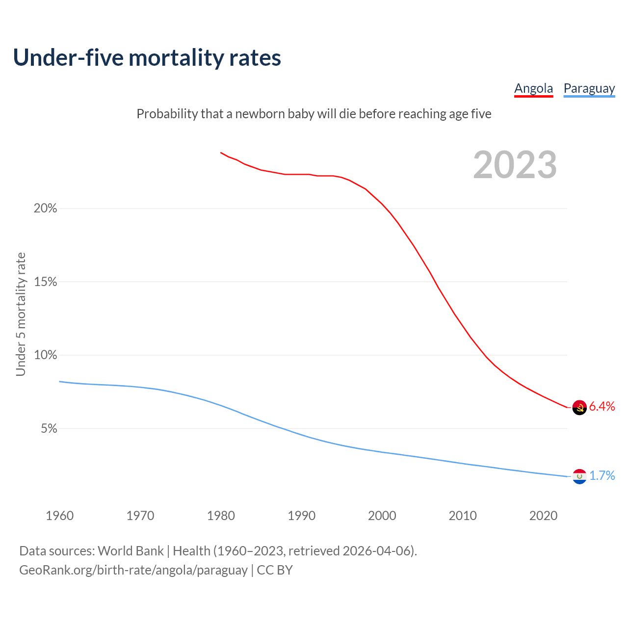 The chance that a newborn baby will die before reaching age five is 6.4% in Angola and 1.7% in Paraguay. Above is a chart with historical data on under-five mortality rates.