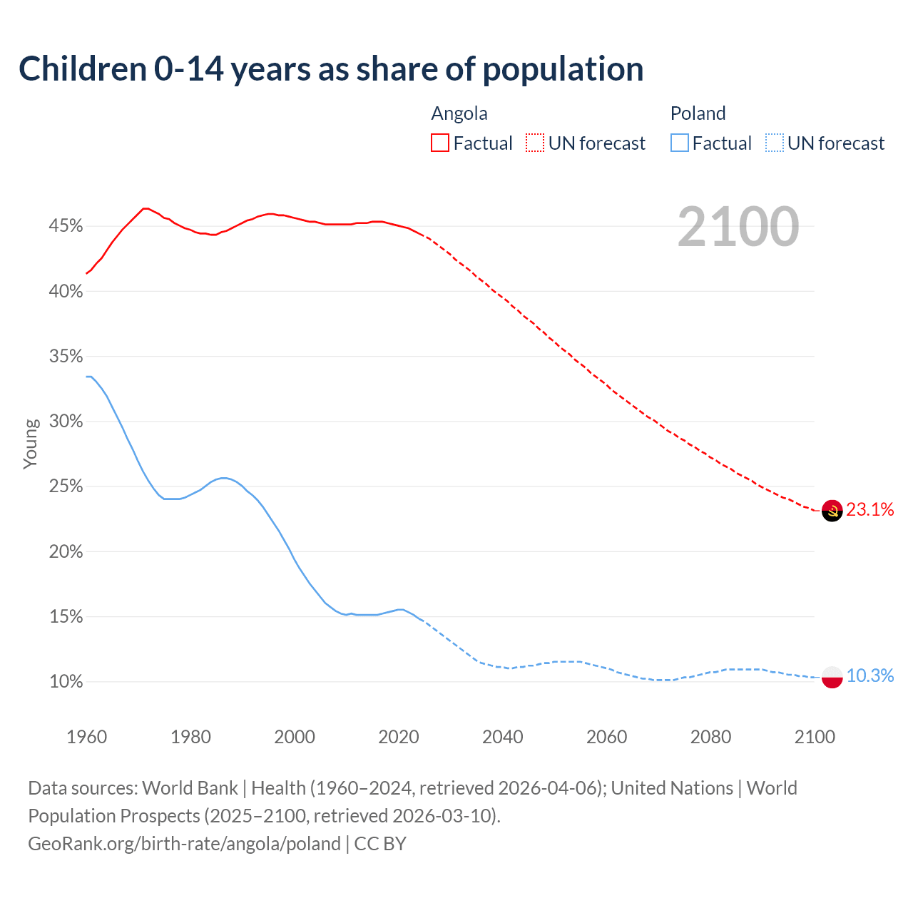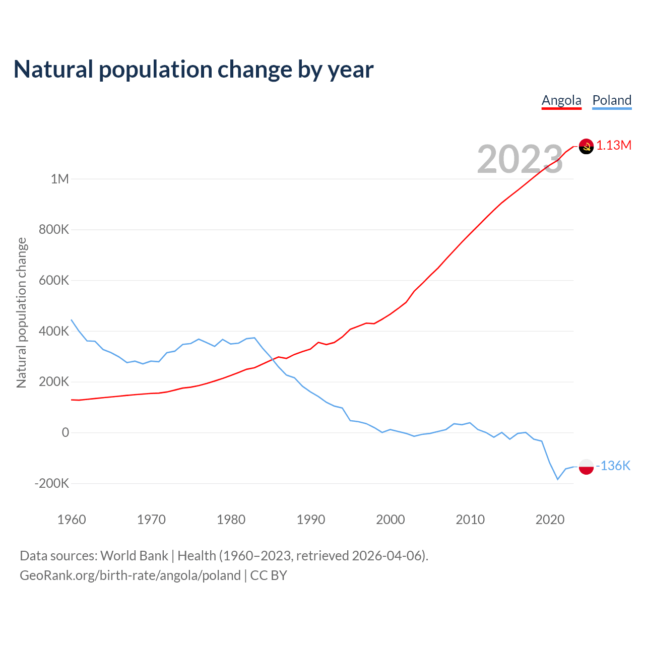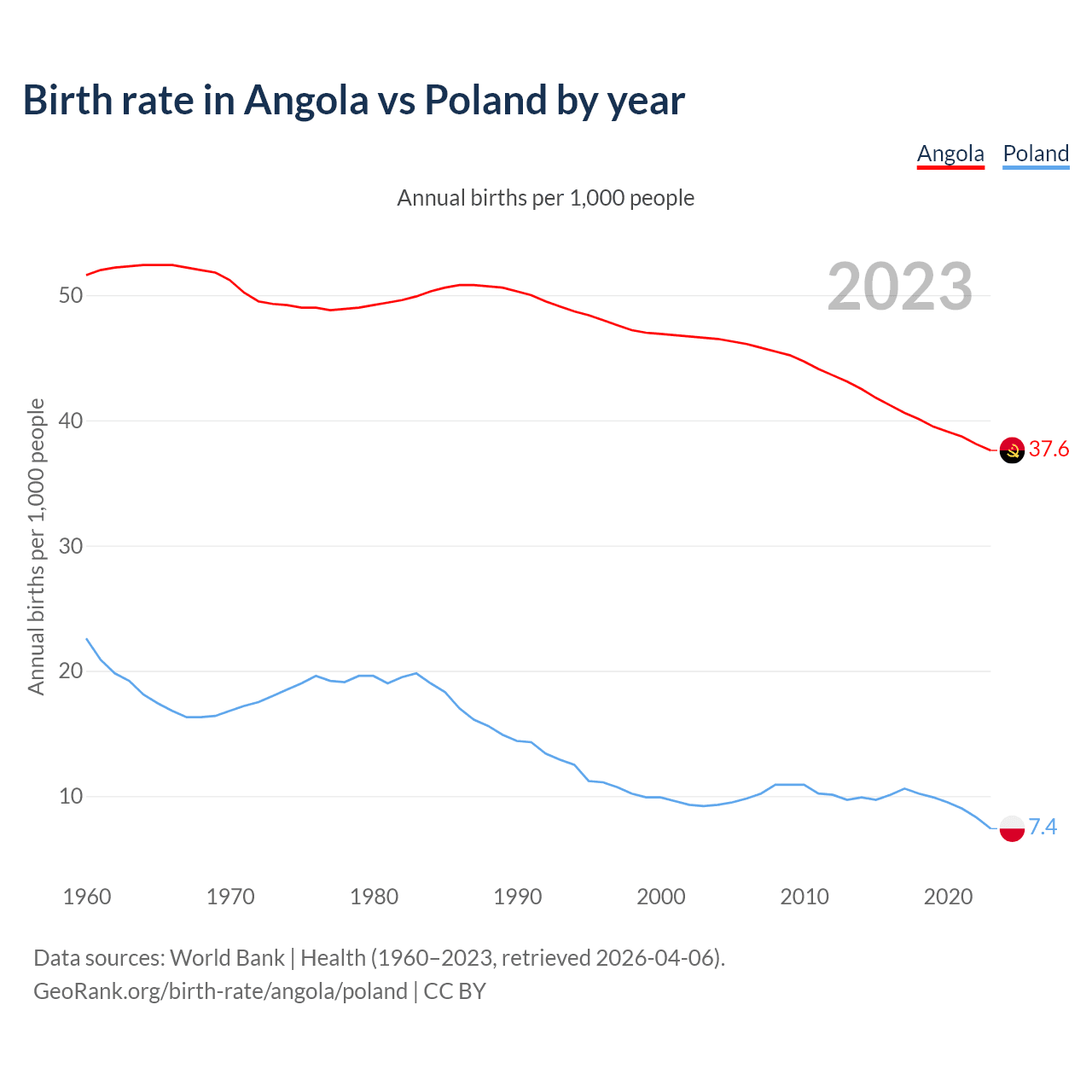 Angola has an annual birth rate of 37.6 births per 1,000 people, compared to 7.4 for Poland. The average number of children a woman is expected to have during her lifetime — the fertility rate, is 5.12 in Angola and 1.16 in Poland — 77.4% difference.